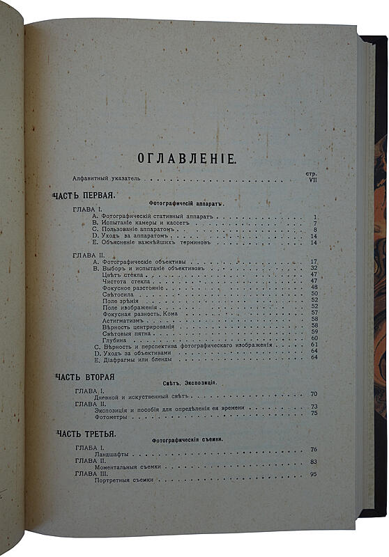 В первой части книги рассматриваются различные типы объективов и уход за ними, а также правила использования фотоаппаратов и их техническое обслуживание. Следующие два раздела посвящены подготовительным мероприятиям, включая установку света и экспозицию. В них подробно описываются методы съёмки различных типов фотографий: портретной, пейзажной, архитектурных деталей, интерьерной съемки и создания репродукций картин.