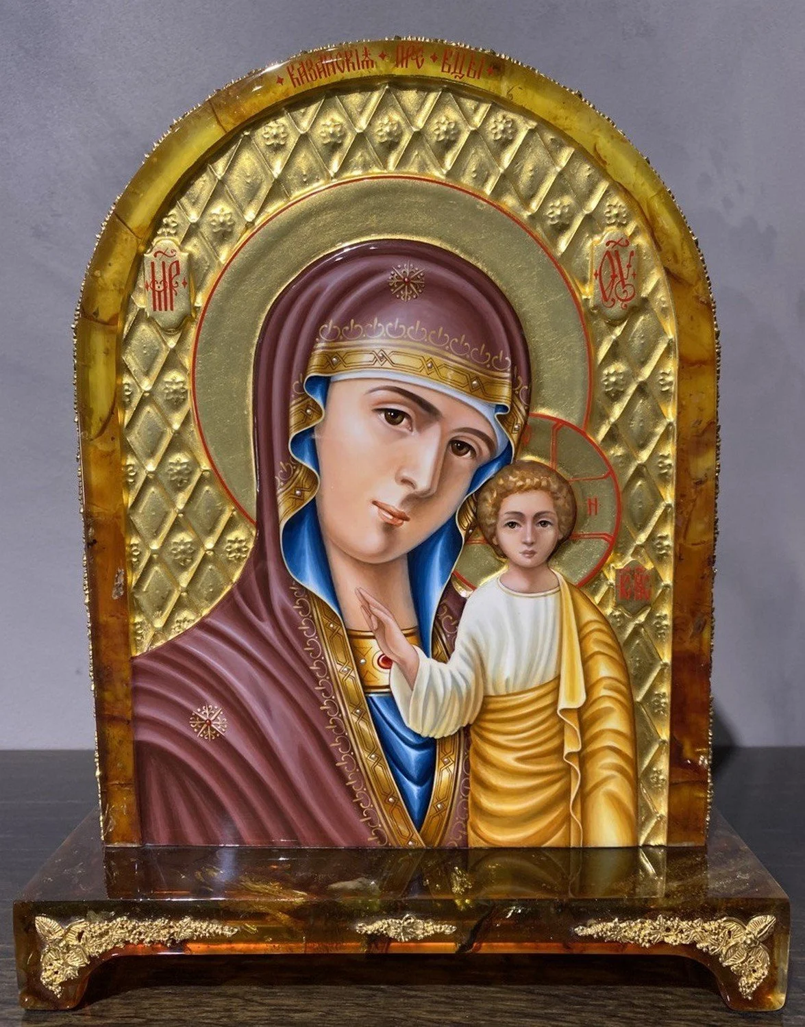 Икона Казанской Божией Матери высоко почитается православными, считается чудотворной и помогает в различных, в том числе очень серьезных нуждах. Предлагаемая вашему вниманию икона создана в полном соответствии с канонической традицией и богато декорирована янтарем и сусальным золотом. Купить икону Казанской Божией Матери ручной работы из янтаря в подарок верующему человеку вы можете в нашем Бутике подарков PrestigeGIFTS.ru с удобной доставкой в любой город России.