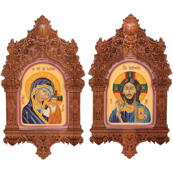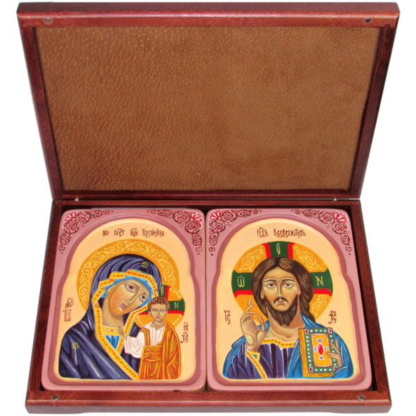 Рукописная пара подарочных икон "Казанская икона Божией Матери" и "Господь Вседержитель" на кипарисе