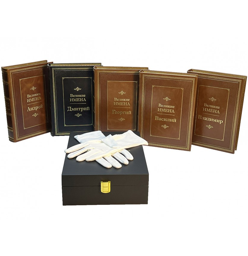 Каждая книга в серии «Великие имена» сдержит биографии выдающихся людей с выбранным именем. Переплет выполнен вручную из натуральной кожи и декорирован художественным тиснением. Каждая книга может быть сделана из коричневой или черной кожи — необходимо уточнить при оформлении заказа. Книжные блоки формата 180х250 мм отпечатаны в цвете на дизайнерской бумаге. В каждом комплекте находятся ювелирные перчатки для просмотра книги.