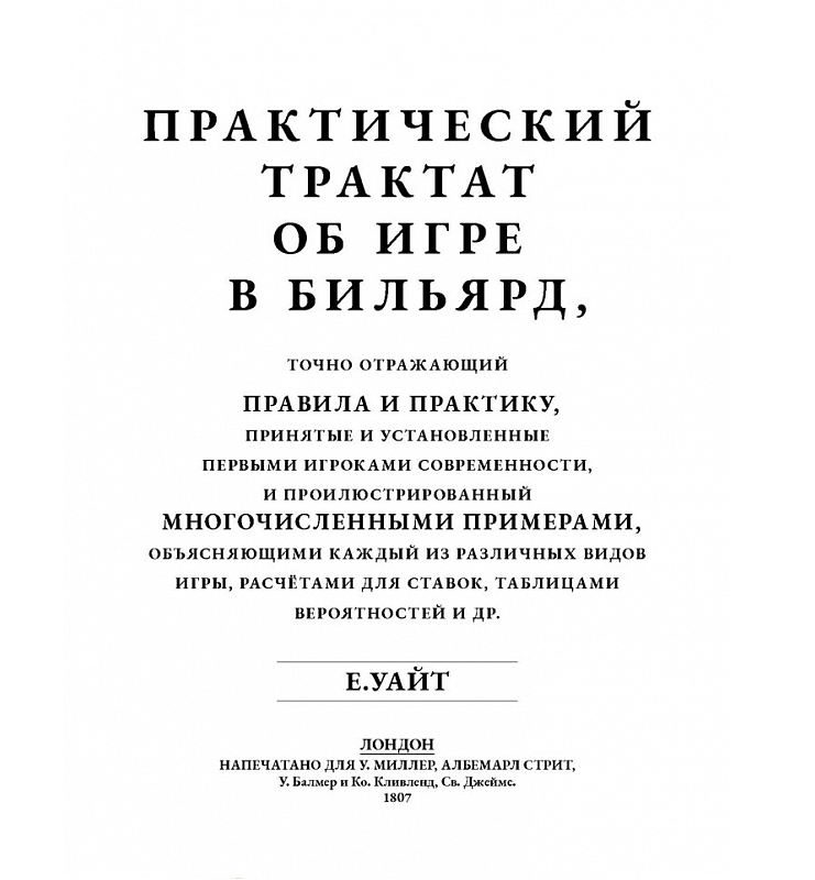 Вашему вниманию представляется уникальное подарочное издание о бильярде в кожаном переплете ручной работы. Это перевод на русский язык фундаментального труда Э. Уайта «A Practical Treatise on the Game of Billiards», впервые опубликованного в 1807 году. Данная работа занимает важное место в истории бильярдной литературы, наряду с анонимным английским пособием «The Game of Billiards», увидевшим свет в 1801 году.