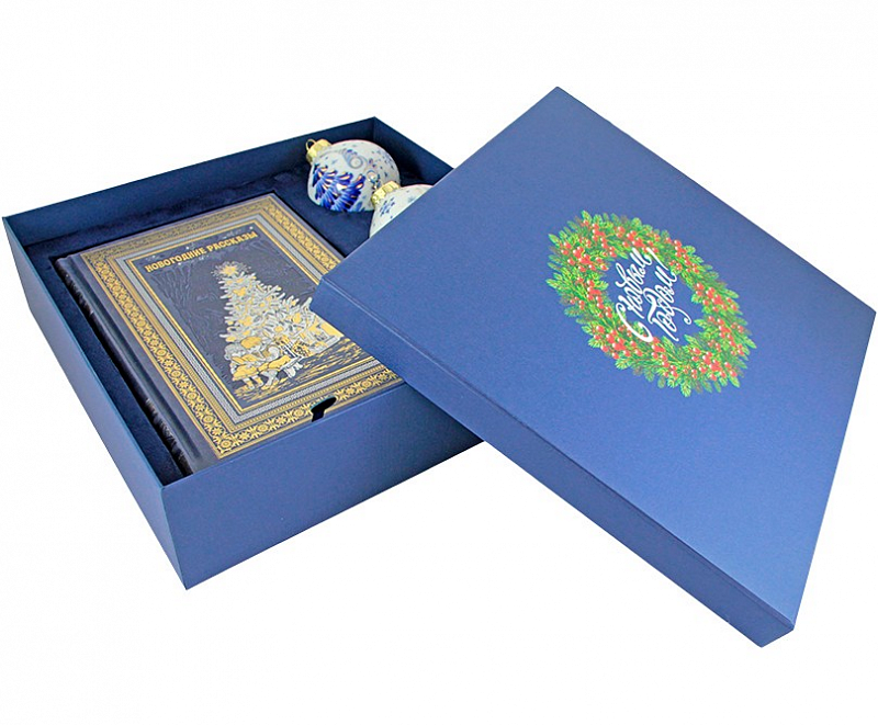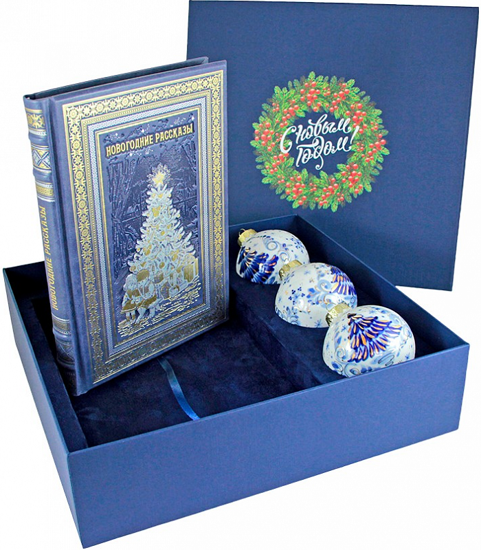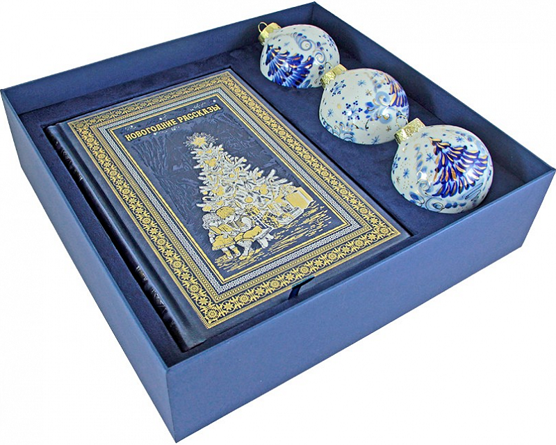 Новогодний подарочный набор с книгой в кожаном переплете ручной работы содержит книгу «Новогодние рассказы» с произведениями известных русских писателей и елочные шары, выполненные в технике гжельской росписи. Книга и шары помещены в красивый подарочный короб ручной работы из дизайнерского картона. Этот красивый новогодний комплект прекрасно подойдет в качестве личного или корпоративного подарка, а купить его быстро и удобно с доставкой в любой город России вы можете в Бутике подарков PrestigeGIFTS.ru!