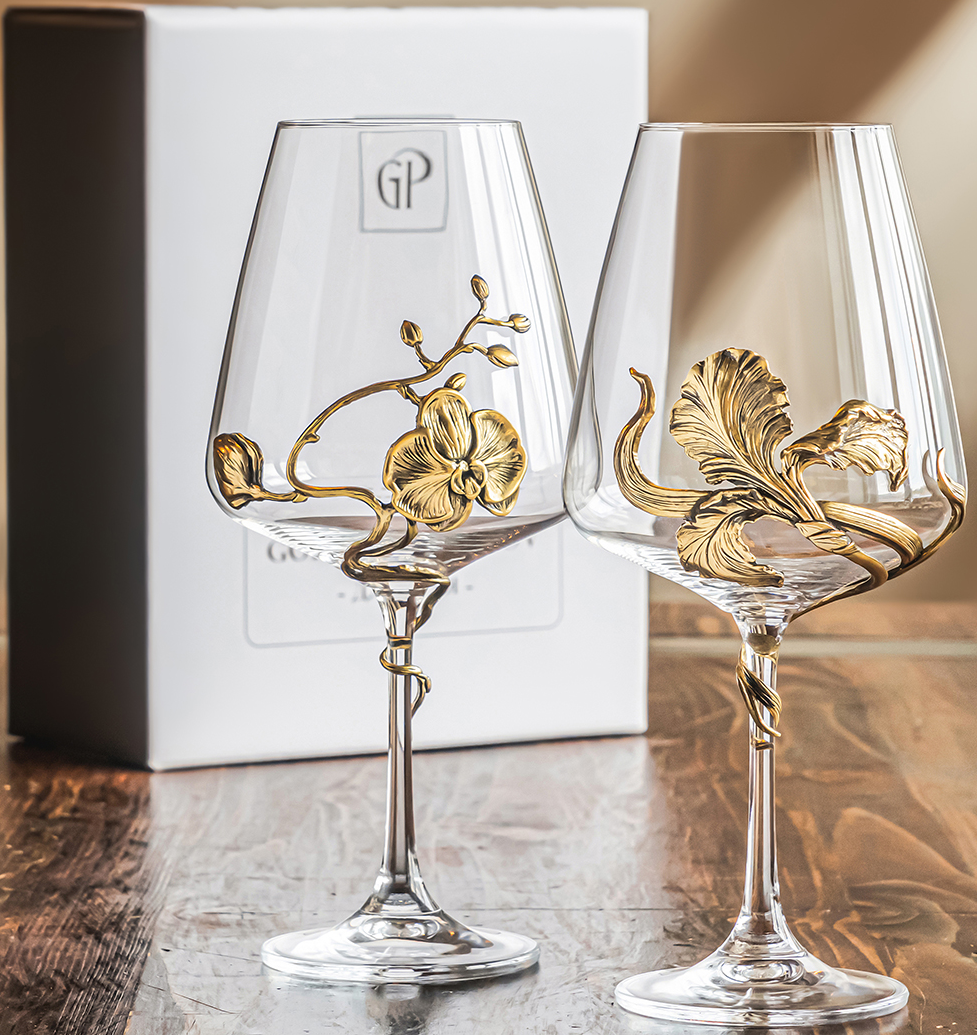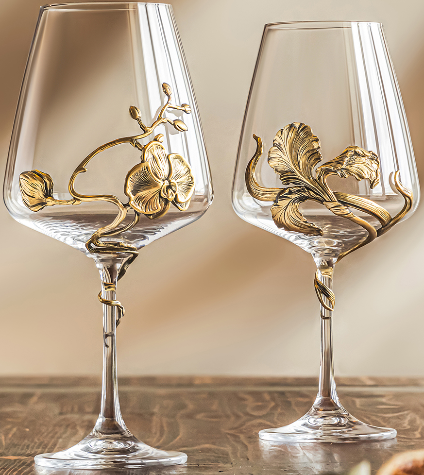 Элегантный подарочный комплект бокалов для вина «Ирис» и «Орхидея» выполнен из особого барного стекла и украшен цветами ириса и орхидеи, выполненными в технике точного художественного литья из латуни. Комплект упакован в презентабельную черно-белую коробку из картона. Этот набор бокалов вы можете преподнести по любому поводу — на 8 марта, на Новый год, на свадьбу, день рождения или юбилей, или же просто чтобы создать отличное настроение, для этого повода совсем не требуется! А мы будем рады доставить этот подарочный набор бокалов «Ирис» и «Орхидея» в точно согласованное с вами время.
