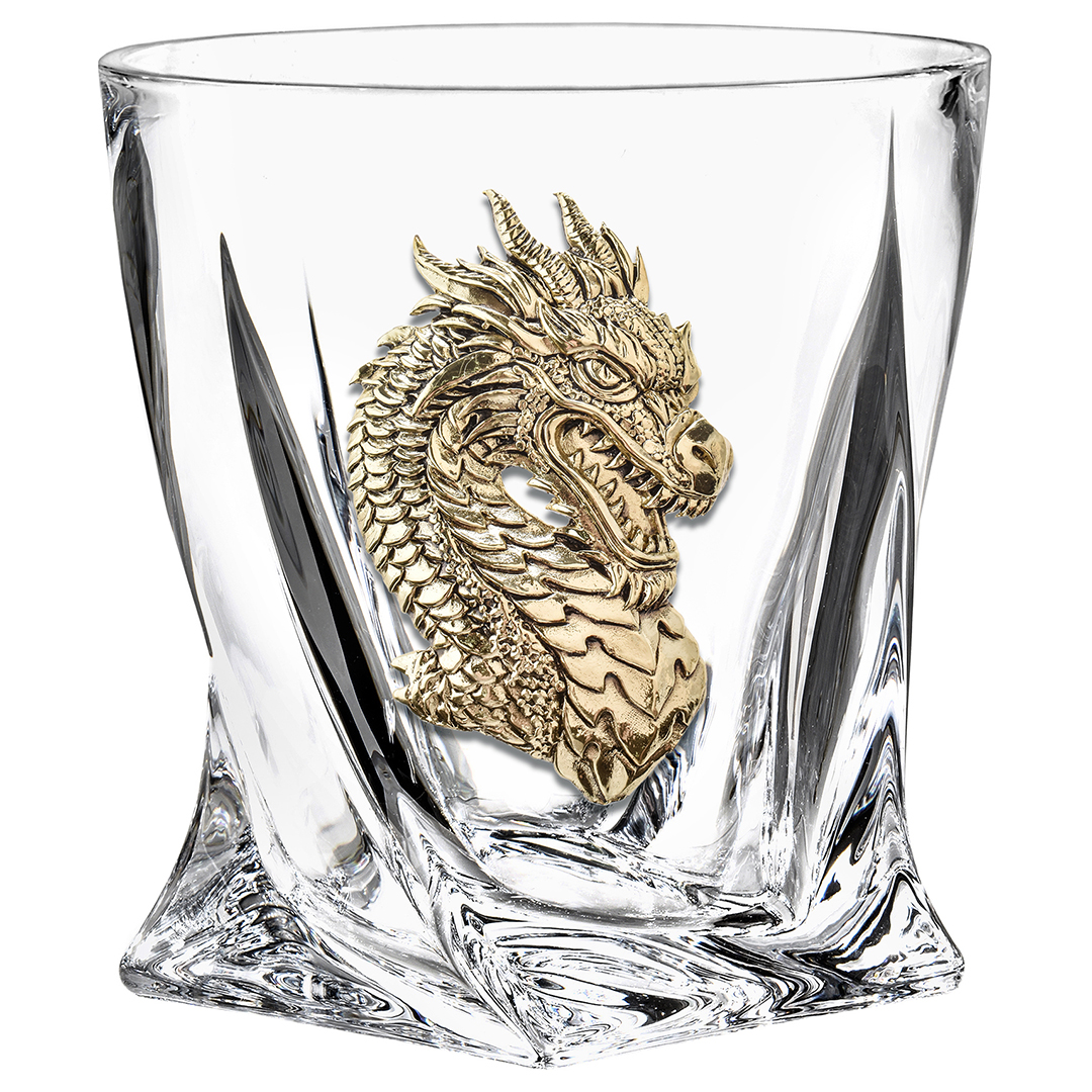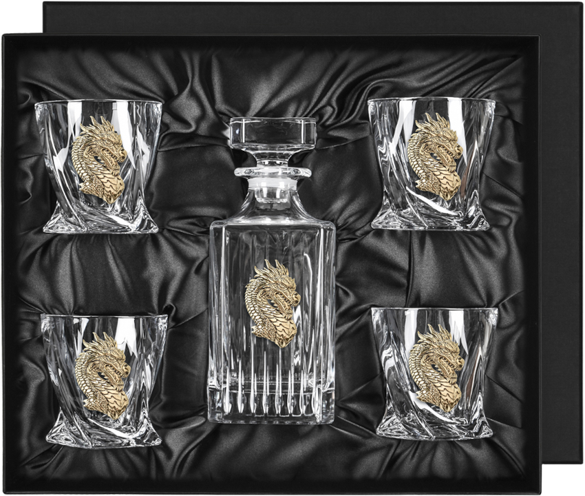 Подарочный комплект бокалов для виски содержит штоф 0,7 л и 4 бокала объемом 340 мл. Все изделия декорированы точным художественным литьем из латуни со стилизованными изображениями дракона — символа силы и власти. Набор поставляется в красивой презентабельной упаковке из дизайнерского картона с мягким ложементом. Выбираете хороший подарок руководителю или коллеге? Это комплект бокалов для виски станет идеальным презентом по любому торжественному случаю.