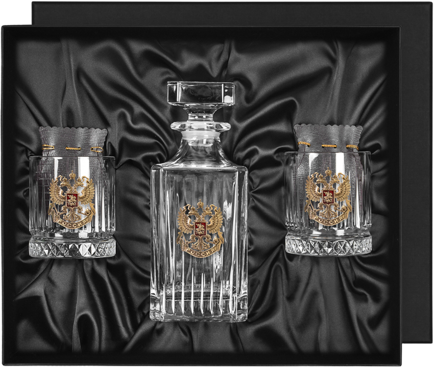Штоф 0,7 л и 2 бокала для виски объемом 355 мл декорированы изображением герба России в технике точного художественного литья из латуни с нанесением ювелирных эмалей. Прилагаются камни для виски. Все изделия помещены в красивую подарочную коробку из дизайнерского картона с мягким ложементом.