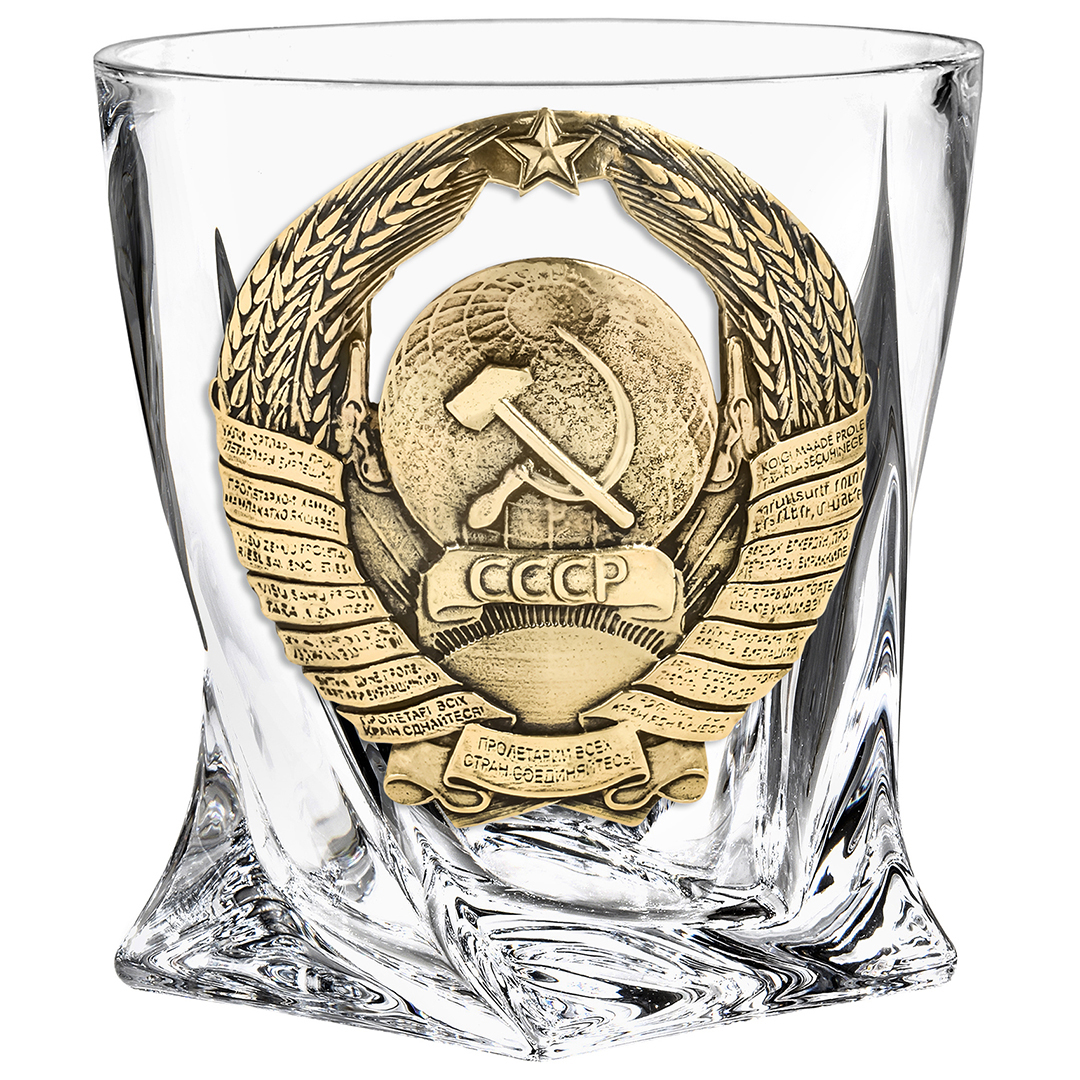 Выбираете красивый подарок с симовликой СССР? Предлагаем подарочный комплект бокалов для виски с камнями и штофом — все изделия украшены латунным художественным литьем в виде герба Союза Советских Социалистических Республик. Изделия помещены в красивый подарочный короб из дизайнерского картона с мягким ложементом внутри.