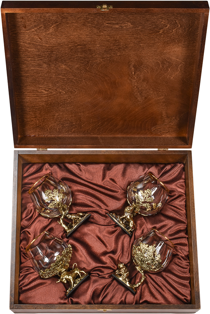 Набор из 4 бокалов для коньяка «Денежный Бык, Медведь, Тигр, Лев» в деревянной шкатулке
