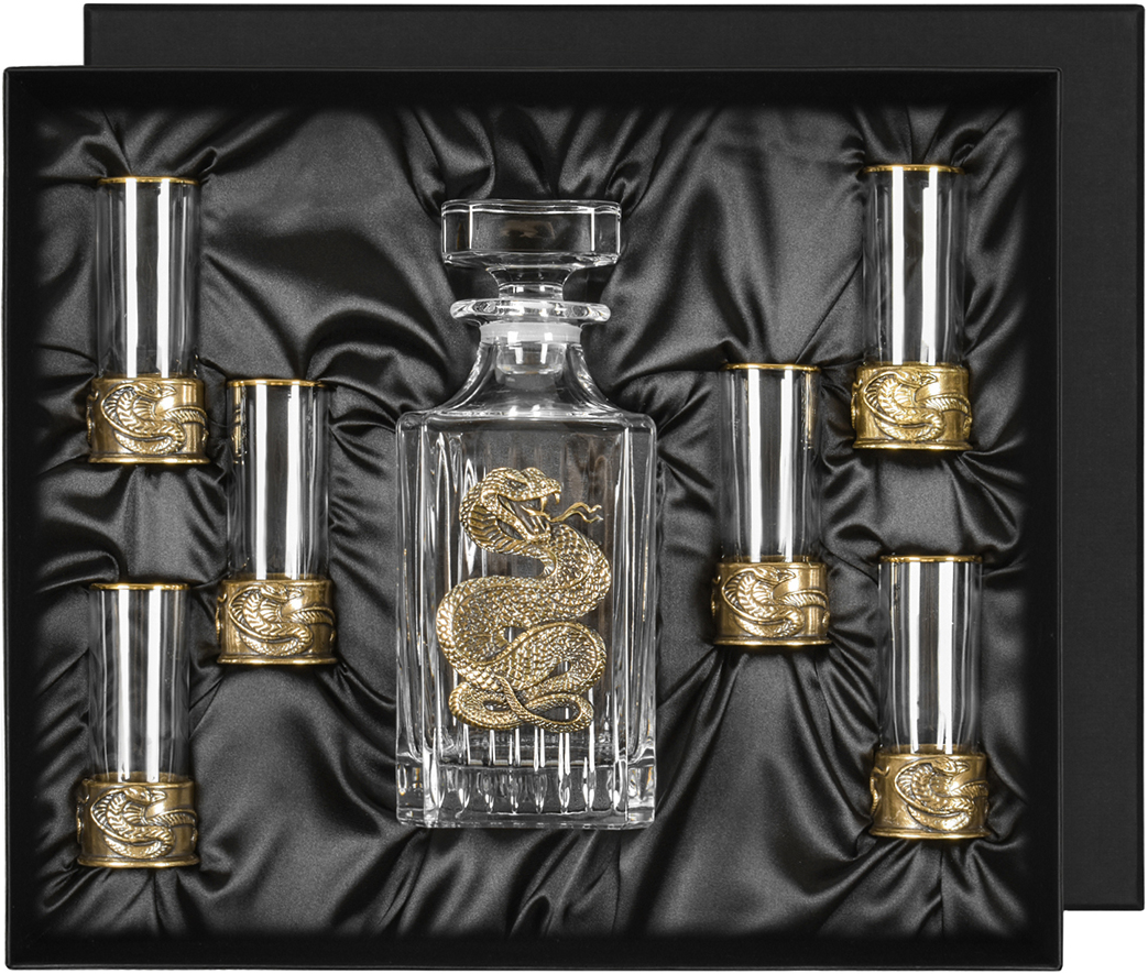В красивую подарочную упаковку с мягким ложементом помещены 6 стопок из стекла с художественным литьем и большой штоф объемом 700 мл. Если вы выбираете красивый и ценный подарок, набор «Змея» для крепких алкогольных напитков — именно тот вариант, который вы, возможно, хотели бы приобрести в качестве презента важному для вас человеку.
