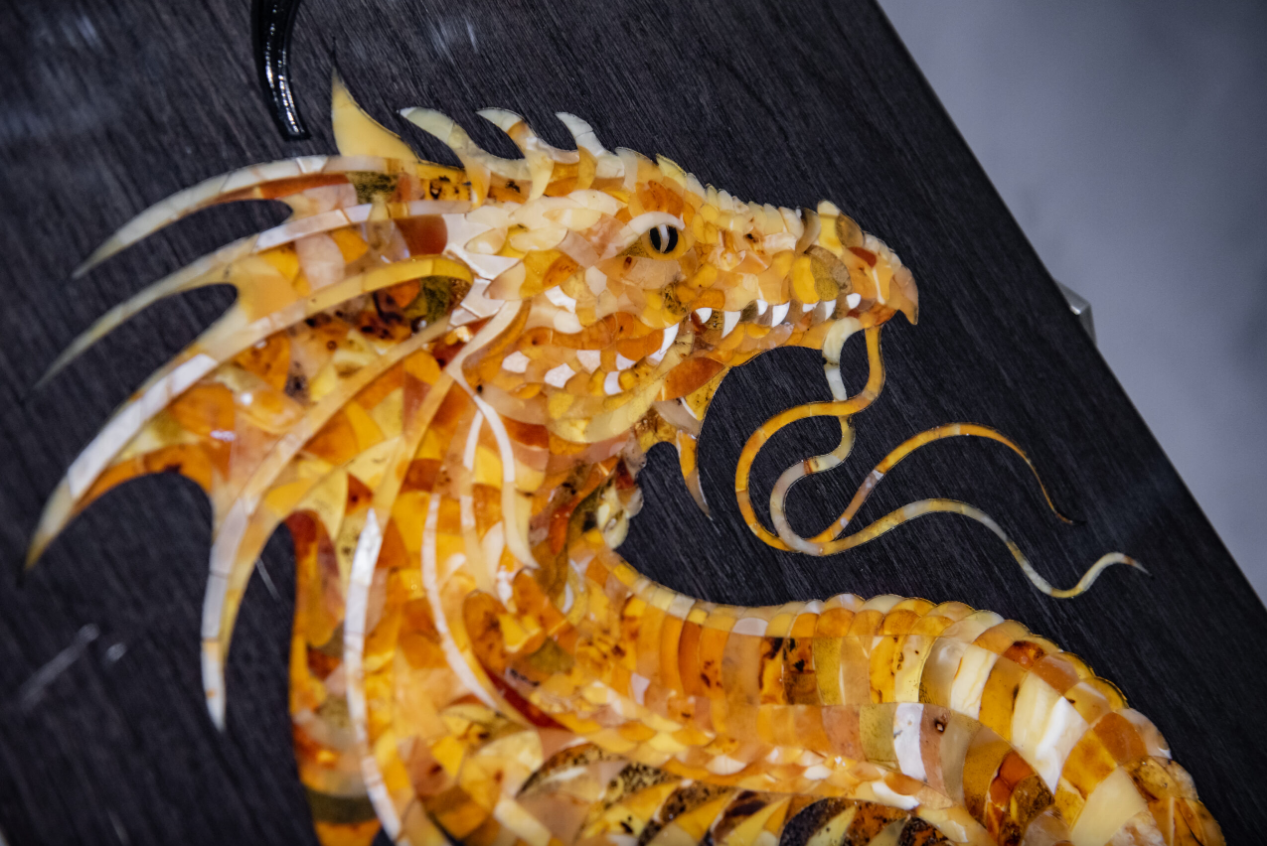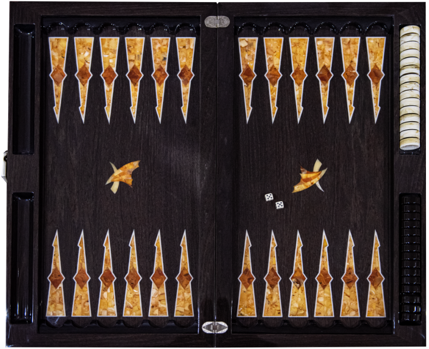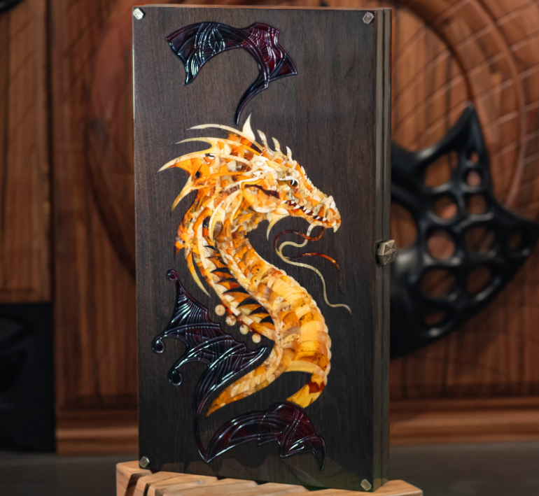 Эксклюзивные нарды ручной работы из тонированной карельской березы с изображением мифического дракона в технике инкрустации балтийским янтарем - отличный подарок любителю этой древней восточной игры!