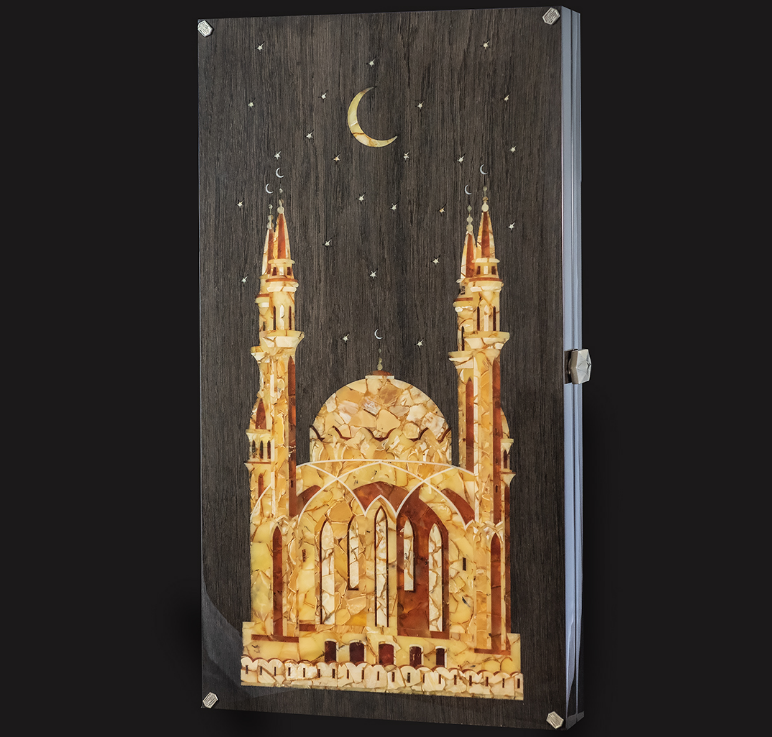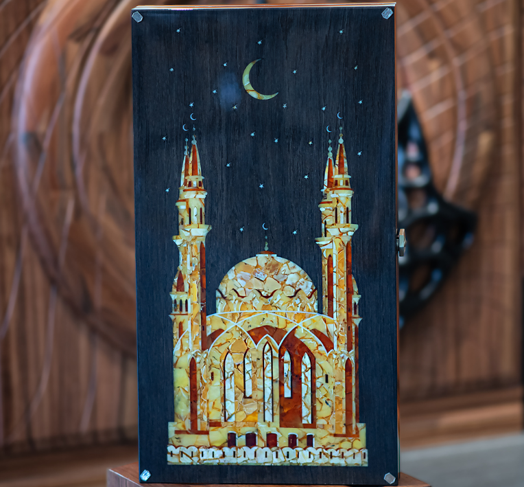 Представляем вашему вниманию коллекционные нарды, выполненные из массива тонированной карельской березы и балтийского янтаря, с изображением мечети «Кул-Шариф», главной мечети Республики Татарстан, расположенной на территории Казанского Кремля.