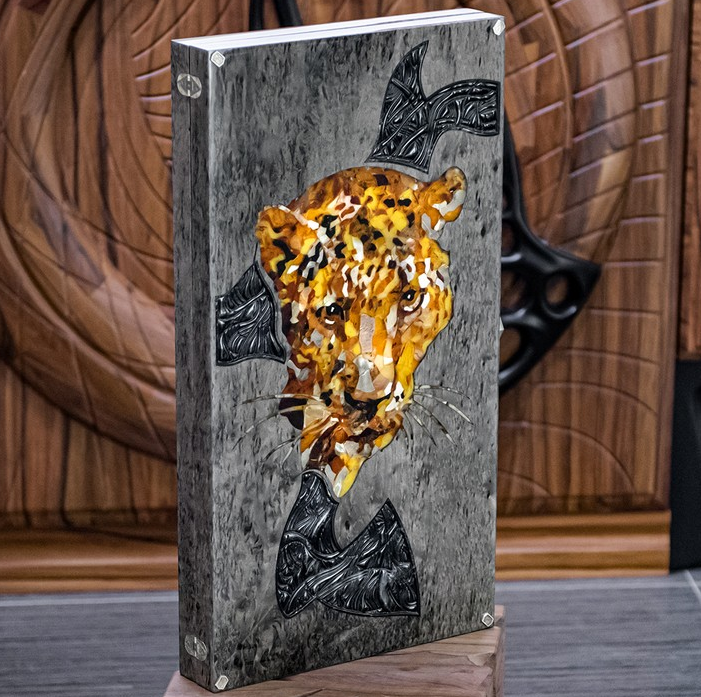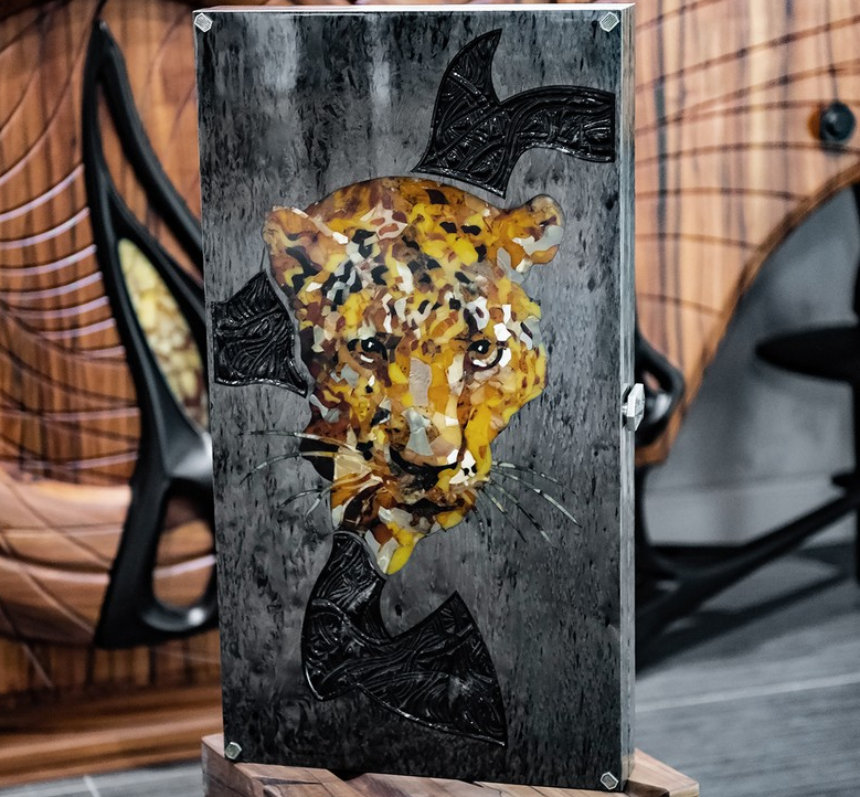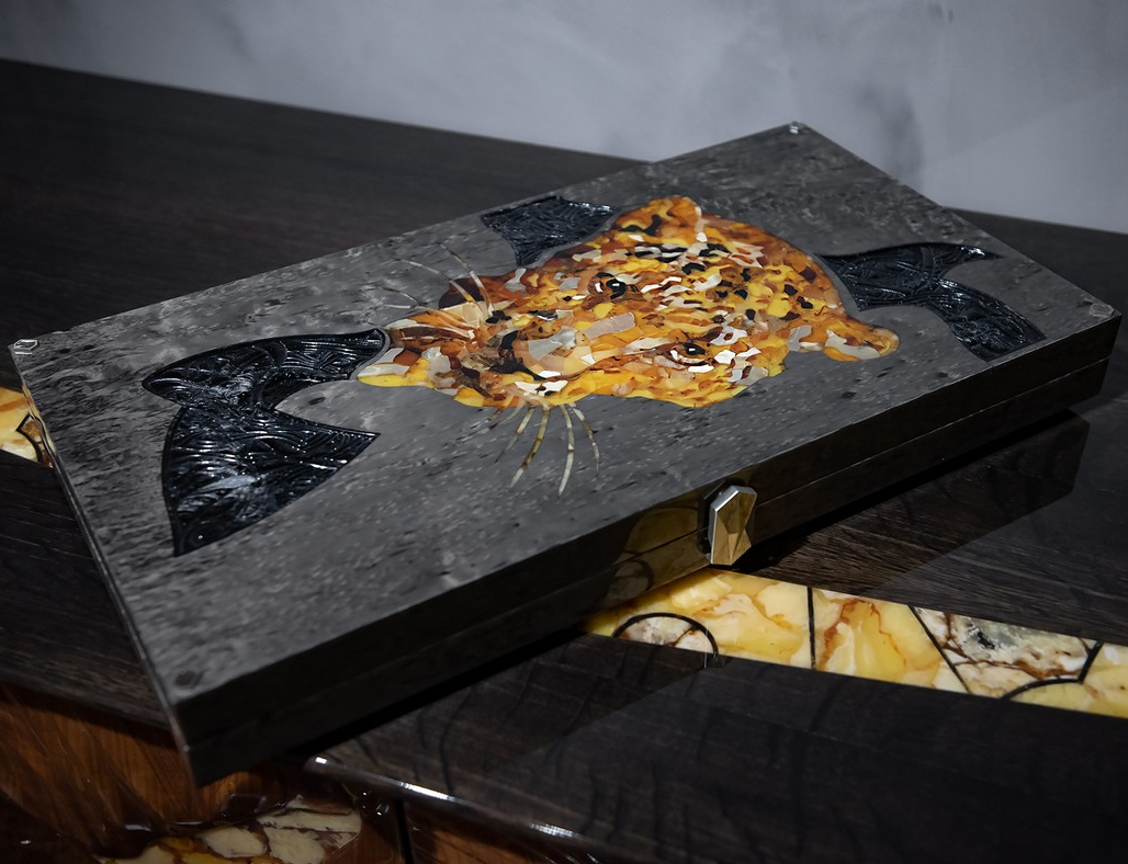 Эксклюзивные нарды ручной работы из мореного дуба с изображением леопарда в технике инкрустации балтийским янтарем - отличный подарок любителю этой древней восточной игры!