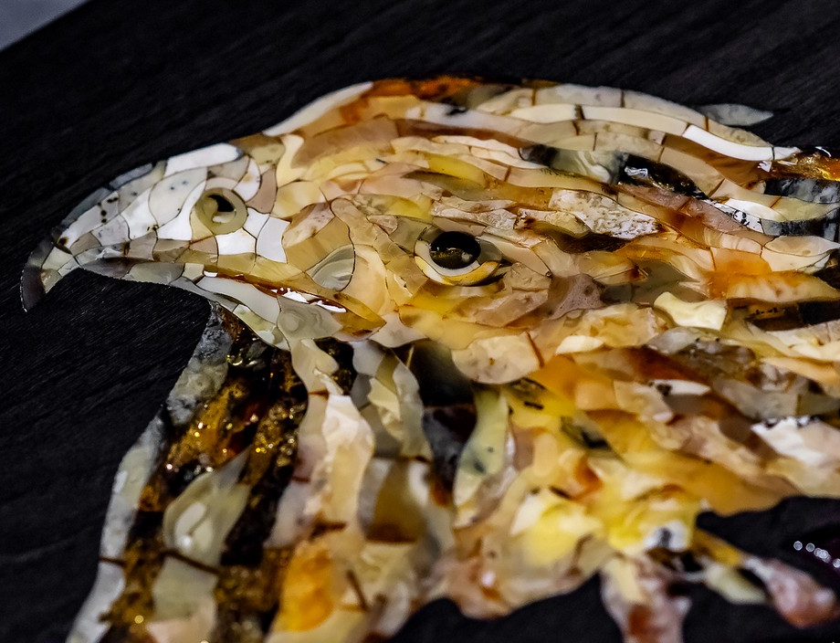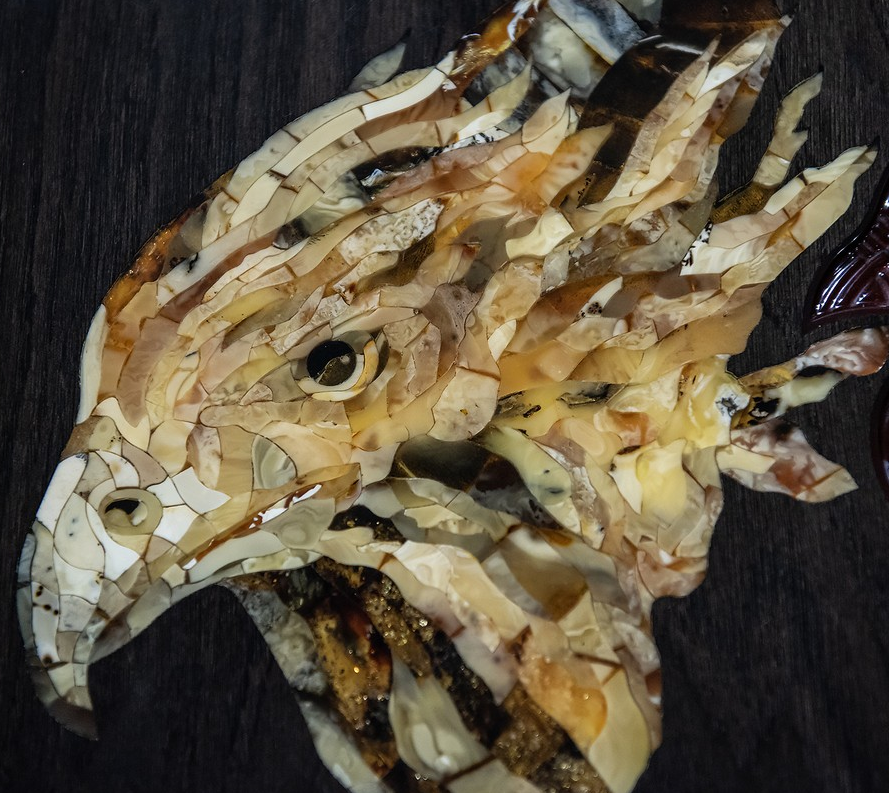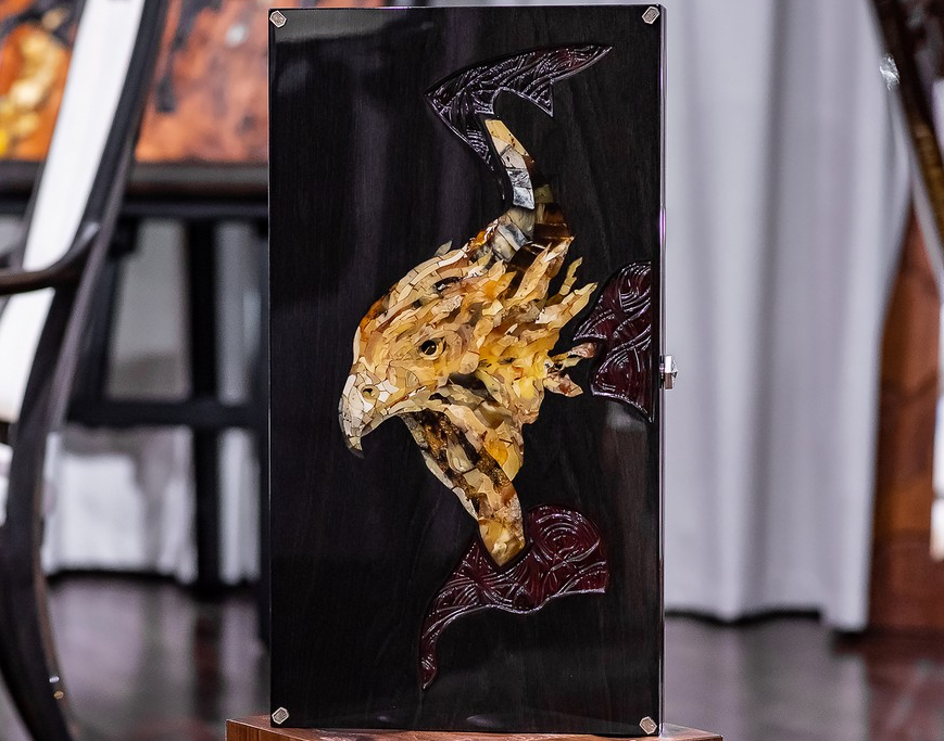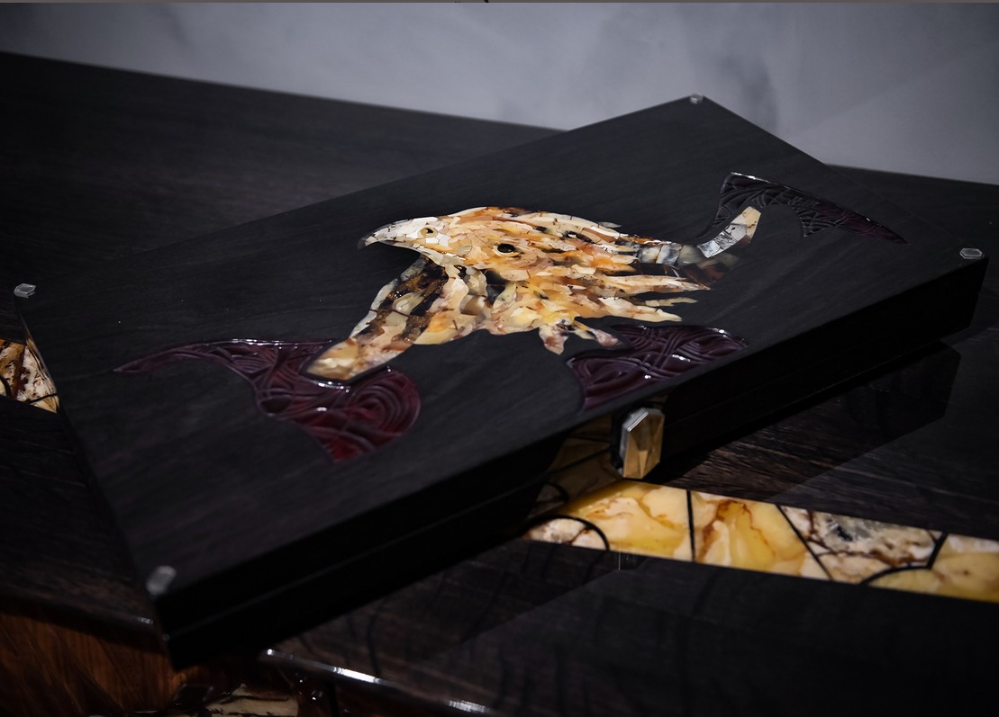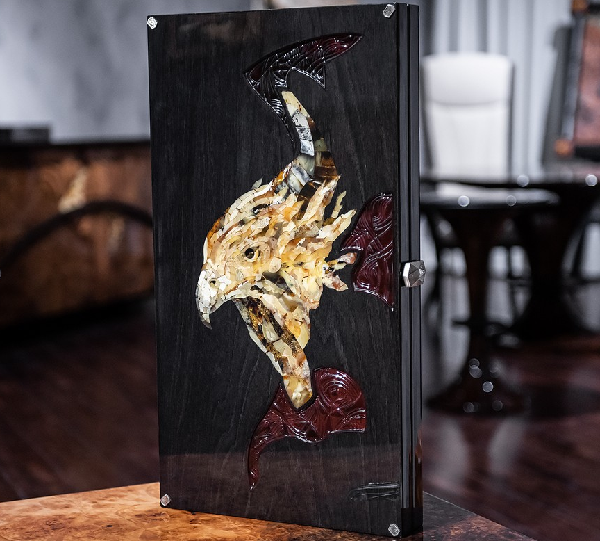 Элитные нарды ручной работы из мореного дуба с изображением орла в технике инкрустации балтийским янтарем - отличный подарок настоящему лидеру!