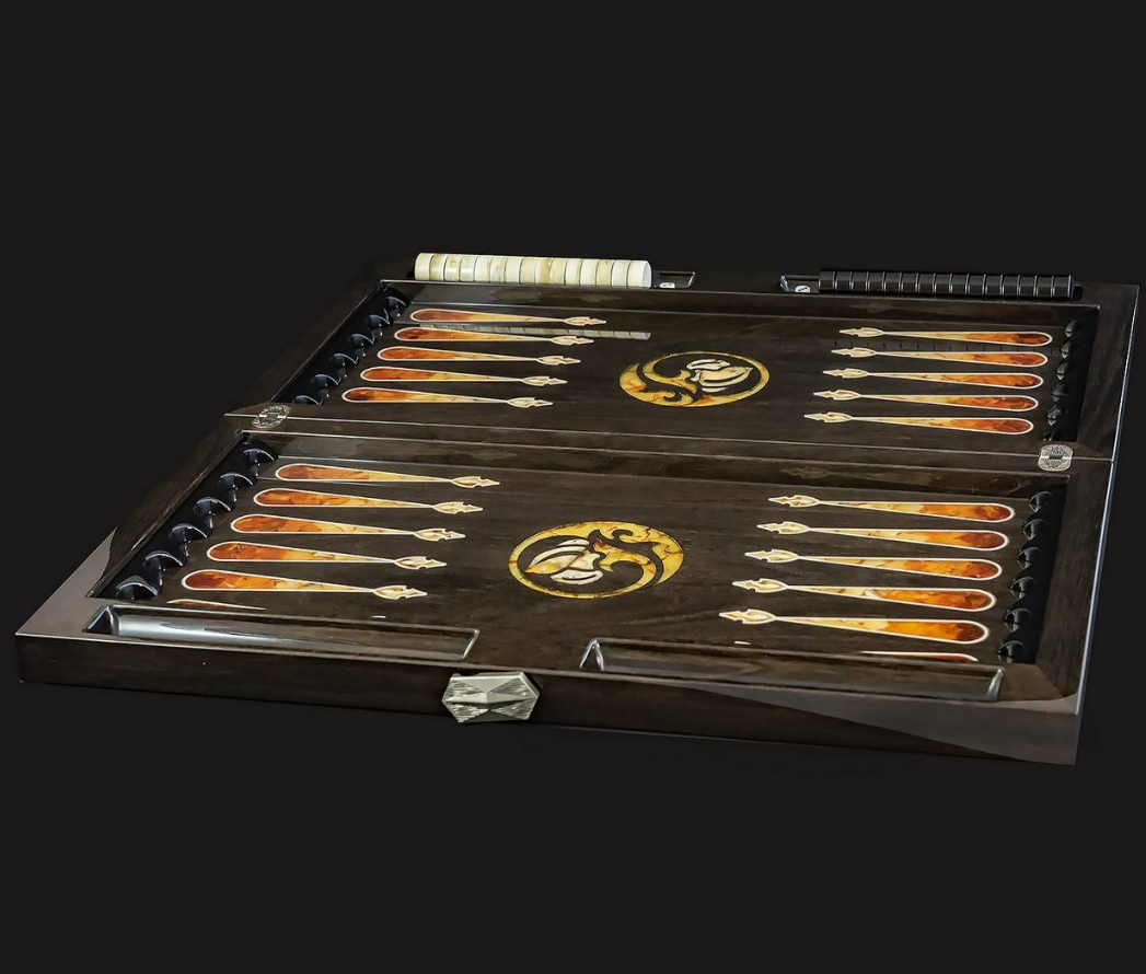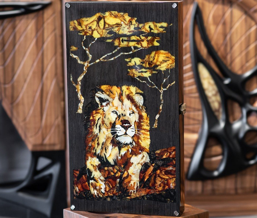 Элитные нарды ручной работы из мореного дуба с изображением льва в саванне в технике инкрустации балтийским янтарем - отличный подарок настоящему лидеру!
