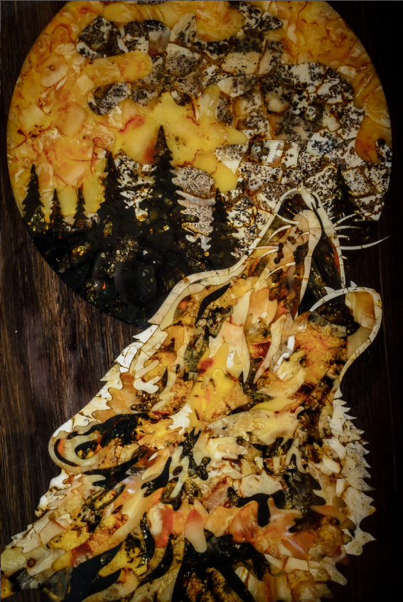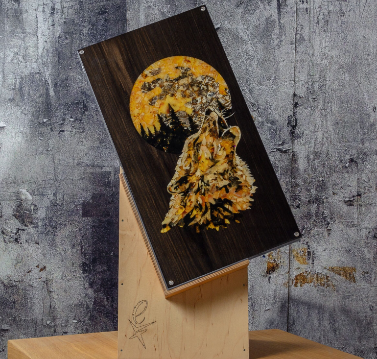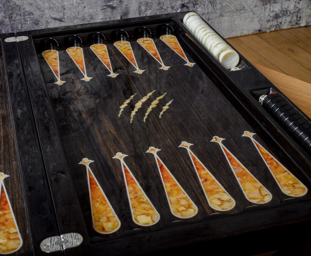 Нарды ручной работы из мореного дуба с изображением волка в технике инкрустации балтийским янтарем - отличный подарок любителю этой древней восточной игры!