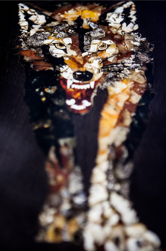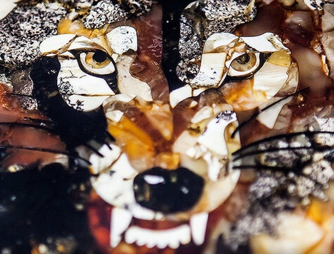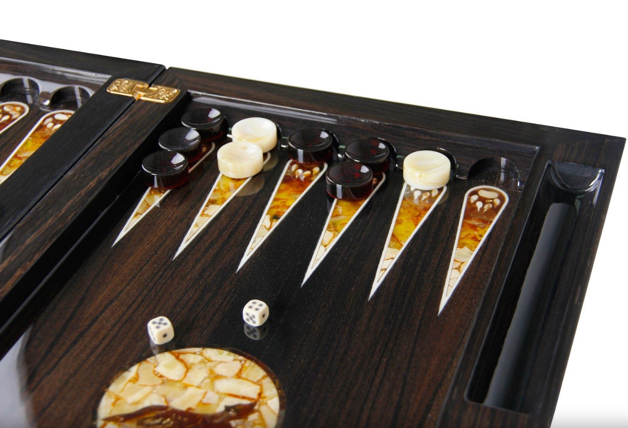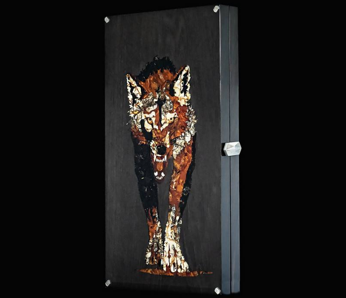 Элитные нарды ручной работы из мореного дуба с изображением волка в технике инкрустации балтийским янтарем - ценный VIP-подарок!