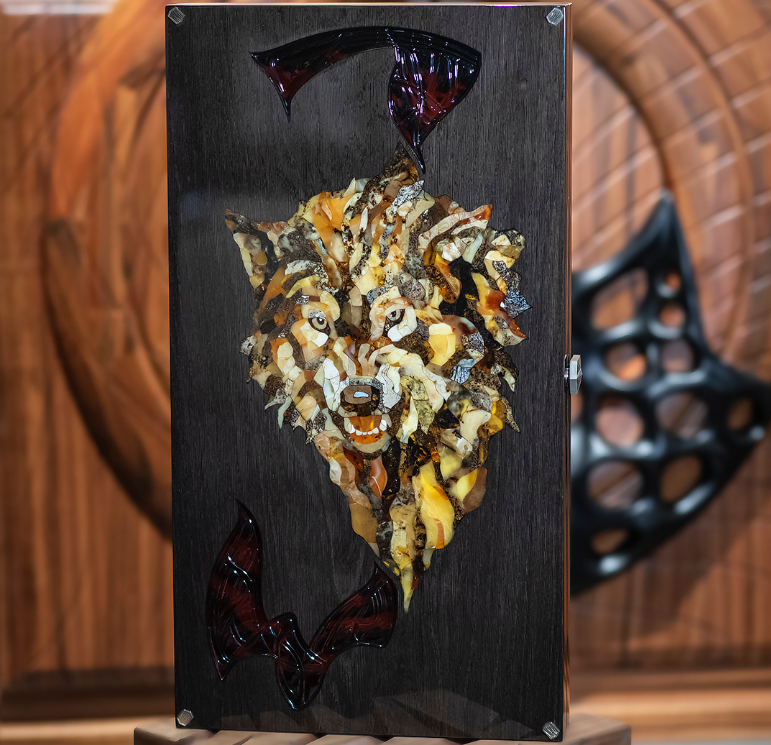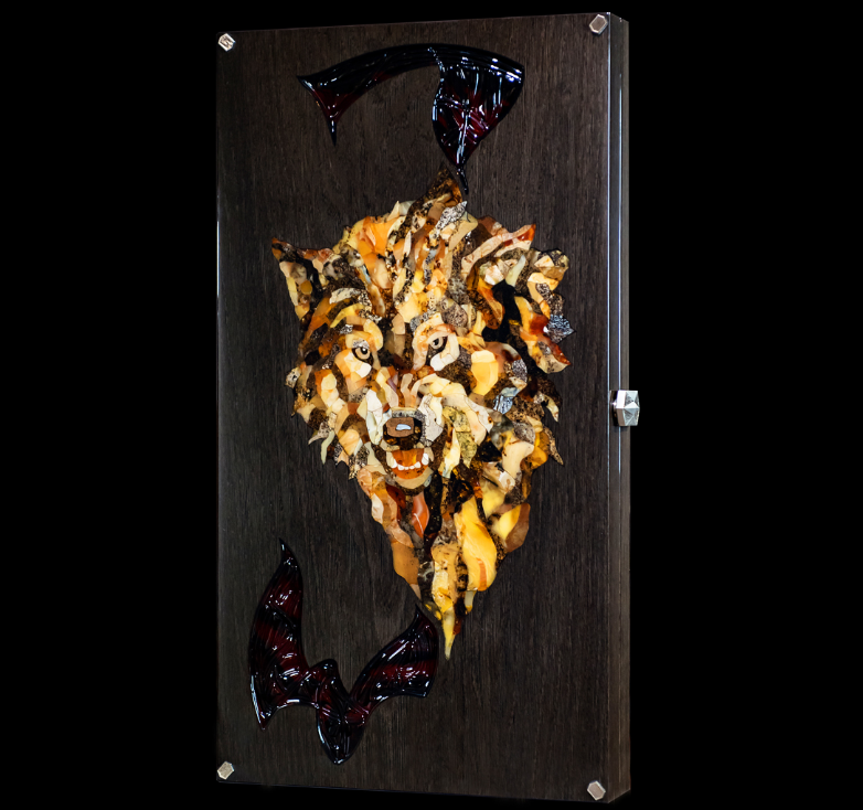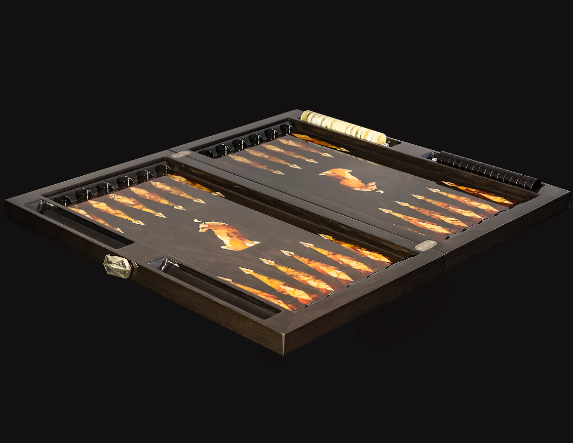 Элитные нарды ручной работы из мореного дуба с изображением волка - вожака стаи в технике инкрустации балтийским янтарем - отличный подарок настоящему лидеру!