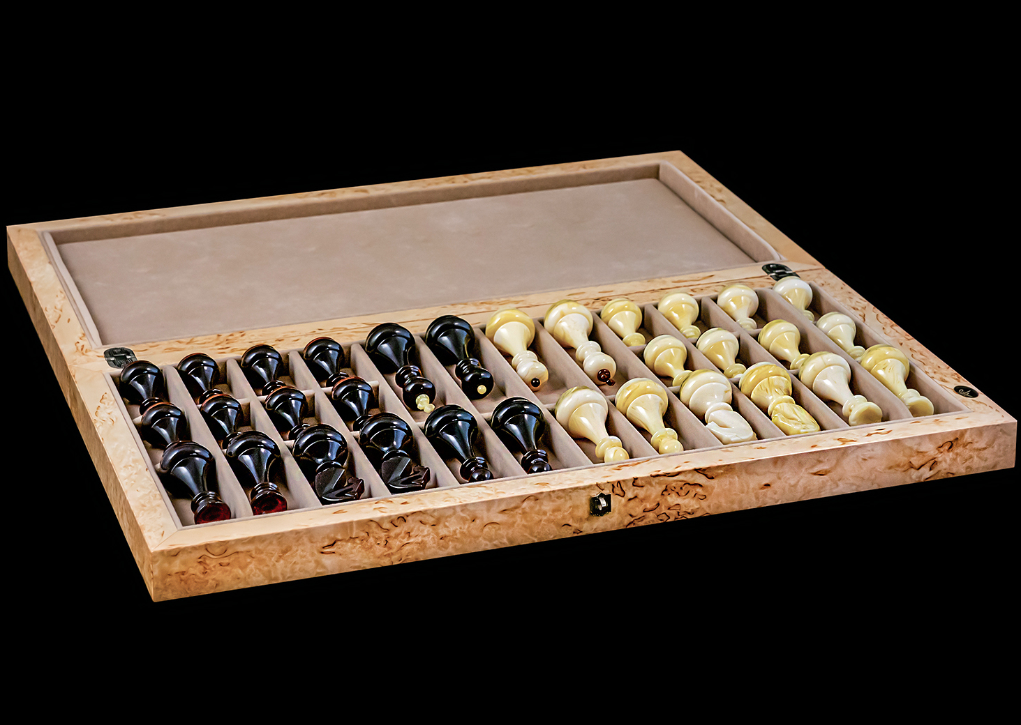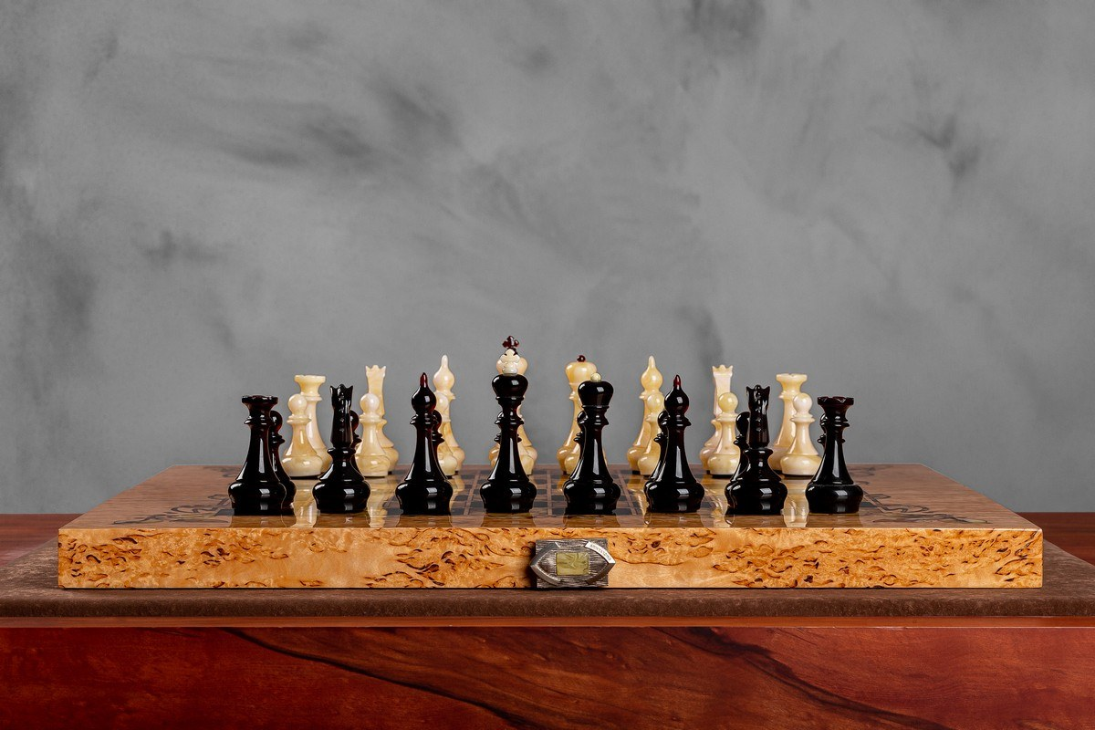 Набор шахмат «Флора» представляет собой выдающийся образец шахматного искусства, который может служить превосходным презентом для истинных ценителей этой интеллектуальной игры. Данный набор изготовлен из карельской березы и декорирован янтарными вставками, что придает ему уникальность и особую эстетическую ценность.