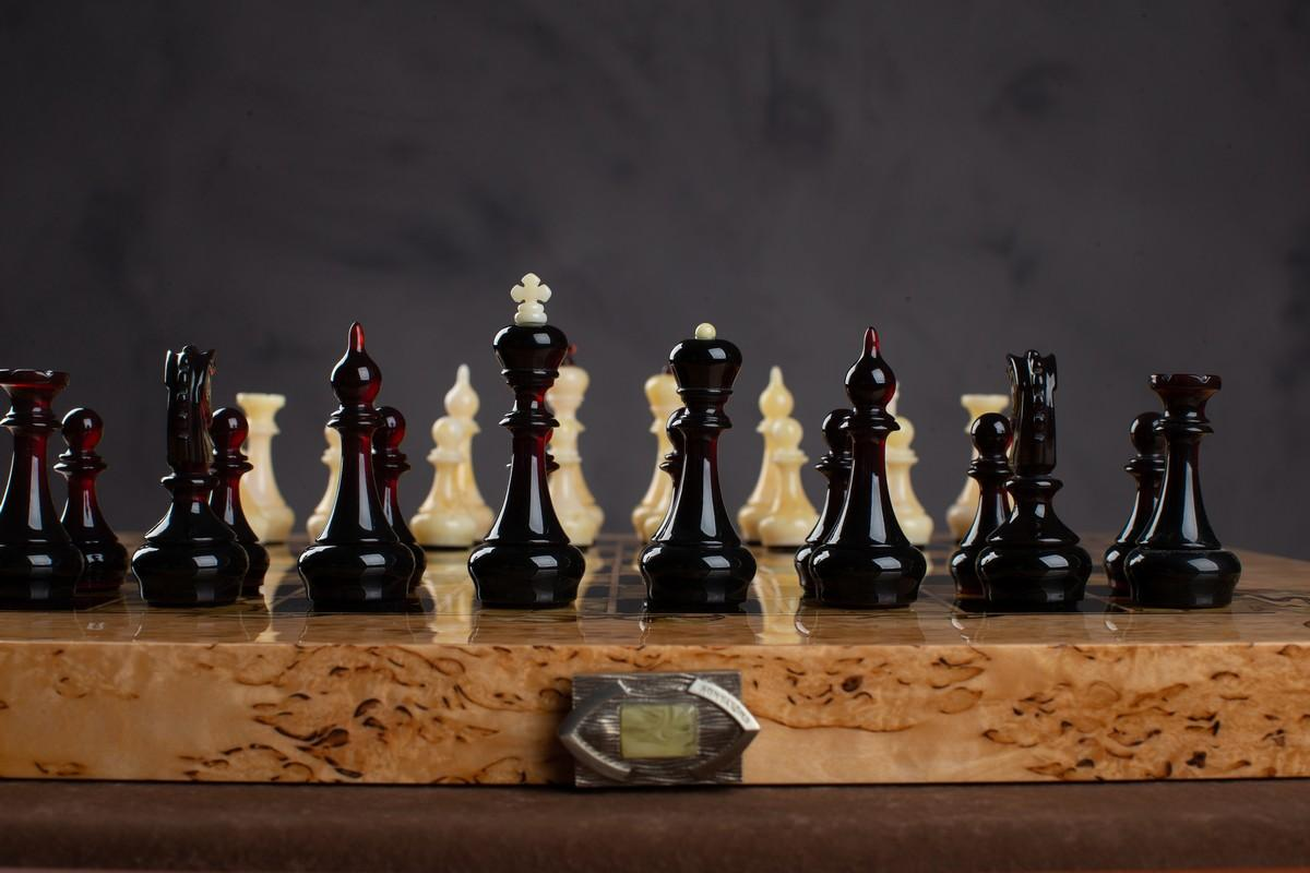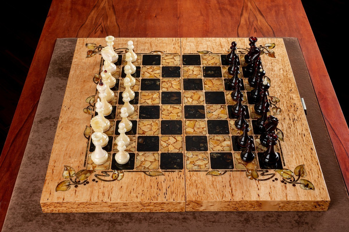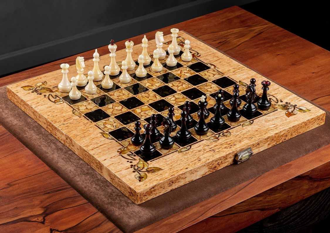 Ключевой особенностью данного набора является использование янтаря, который не только украшает шахматы, но и подчеркивает их роскошный и изысканный дизайн.
