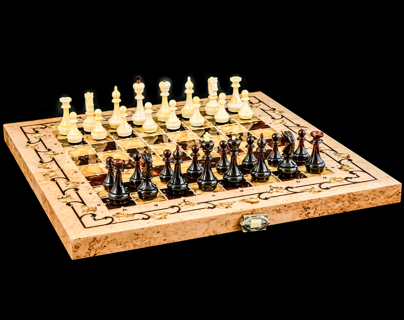 Подарочные шахматы «Готика» в красивом кейсе, изготовленные из природных материалов, представляют собой уникальный синтез высокой эстетической ценности и исключительной долговечности. Основным конструктивным элементом данных шахмат является древесина карельской березы, отличающаяся выдающимися механическими характеристиками и эстетически привлекательной текстурой благодаря своим уникальным физико-химическим свойствам и полиморфному цветовому спектру. Включение янтаря в дизайн шахмат не только придает изделию дополнительные эстетические достоинства, но и подчеркивает его историческую и культурную значимость. Янтарь, обладающий высокой художественной и археологической ценностью, является символом древних традиций и культурного наследия.
