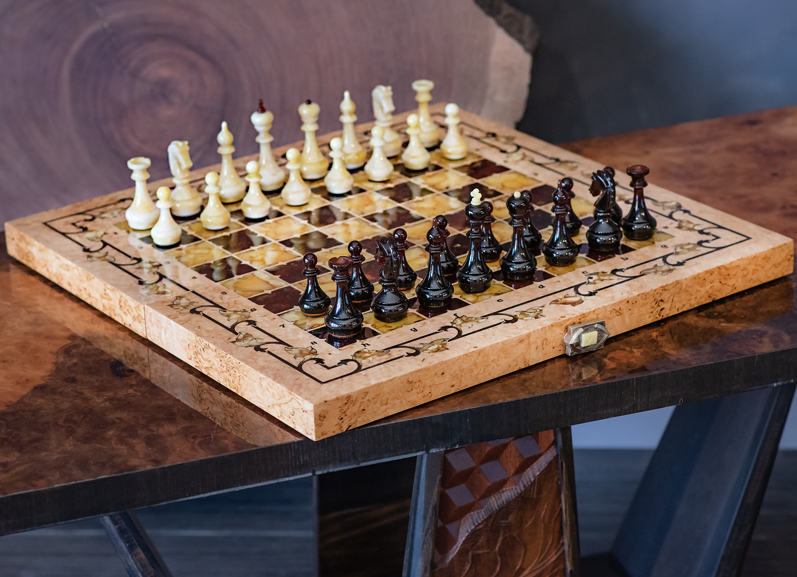 Ручная работа, инкрустация шахматной доски выполнена в технике маркетри