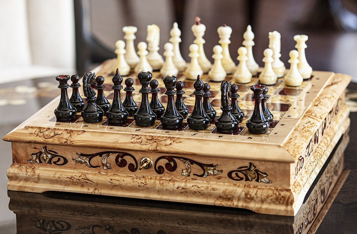 Ларец из карельской березы — словно шкатулка, хранящая многовековые секреты северных лесов. Его древесина, с причудливыми узорами и мягким золотистым отливом, становится изысканным обрамлением для интеллектуальной битвы.