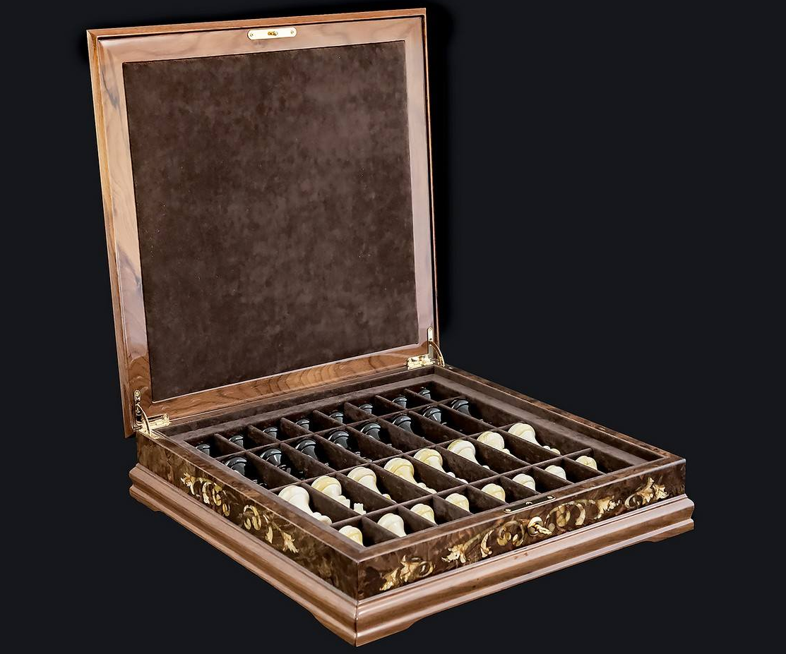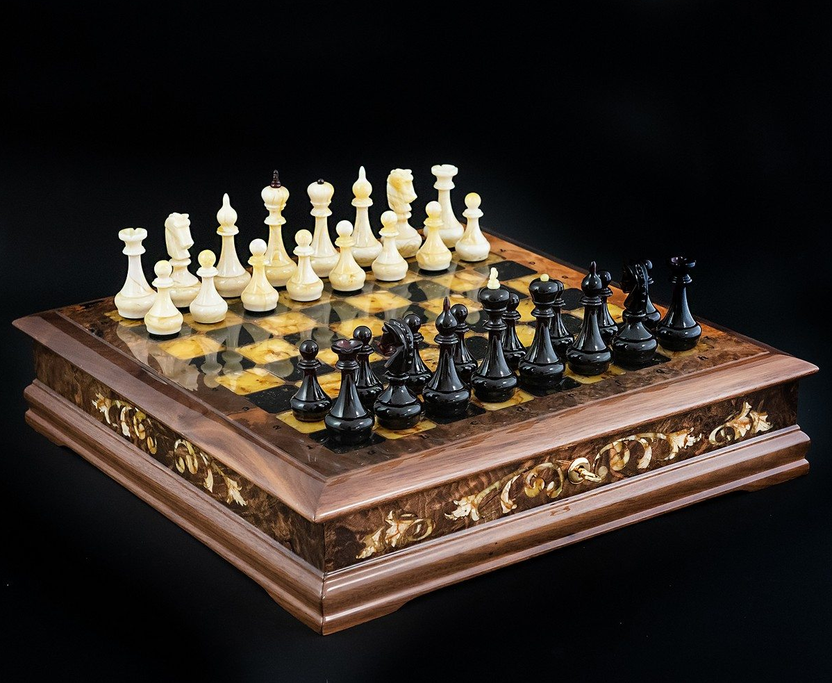 Изысканное сочетание благородной древесины и янтаря превращает этот набор не просто в игровой аксессуар, а в камерную скульптуру для интеллектуального ритуала. Корпус из массива ореха, обработанный вручную и инкрустированный янтарем в технике маркетри, хранит в себе теплоту природных линий и благородство темных прожилок, словно приглашая прикоснуться к вековым традициям мастеров.