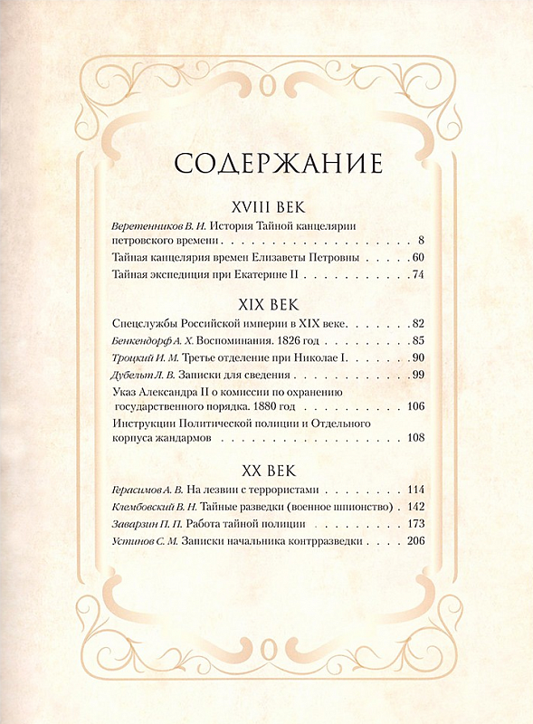 Книга содержит уникальные архивные документы и мемуары руководителей секретных ведомств дореволюционной России, которые можно рассматривать как предшественников современных Федеральной службы безопасности (ФСБ), Главного разведывательного управления (ГРУ) и Службы внешней разведки (СВР). Хронологический охват исследования простирается от начала XVIII века до начала XX века, что позволяет всесторонне проанализировать эволюцию отечественных спецслужб в контексте исторических трансформаций.