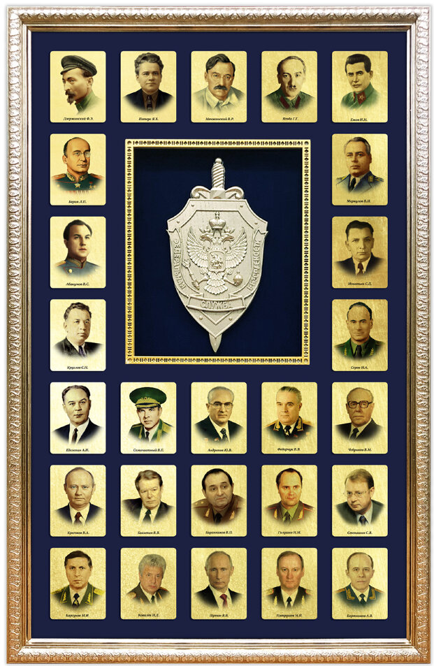 На бархатном паспарту размещены миниатюрные портреты руководителей ведомства на сусальном золоте. В центре композиции — объёмный барельеф с гербом ФСБ. Панно выполнено в классическом багете с креплением для удобного размещения на стене.