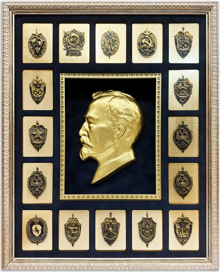 Центральным элементом панно является барельеф, изображающий Феликса Эдмундовича Дзержинского, основателя Всероссийской Чрезвычайной Комиссии (ВЧК). Барельеф выполнен в технике художественного литья, что позволяет достичь высокой степени детализации и реализма. Вокруг центрального изображения расположены шестнадцать окон, в которых размещены памятные знаки, символизирующие ключевые этапы эволюции органов государственной безопасности России — от ВЧК до Федеральной Службы Безопасности (ФСБ).