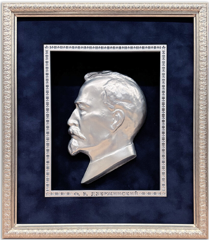 Предлагаем вашему вниманию художественное панно с портретом Феликса Эдумундовича Дзержинского, выполненным в виде барельефа, покрытого металлом, и помещенным в багет с паспарту из бархата. Портрет выдающегося государственного деятеля эпохи ранней Советской республики станет отличным подарком сотруднику ФСБ, подчеркивая преемственность исторической традиции.