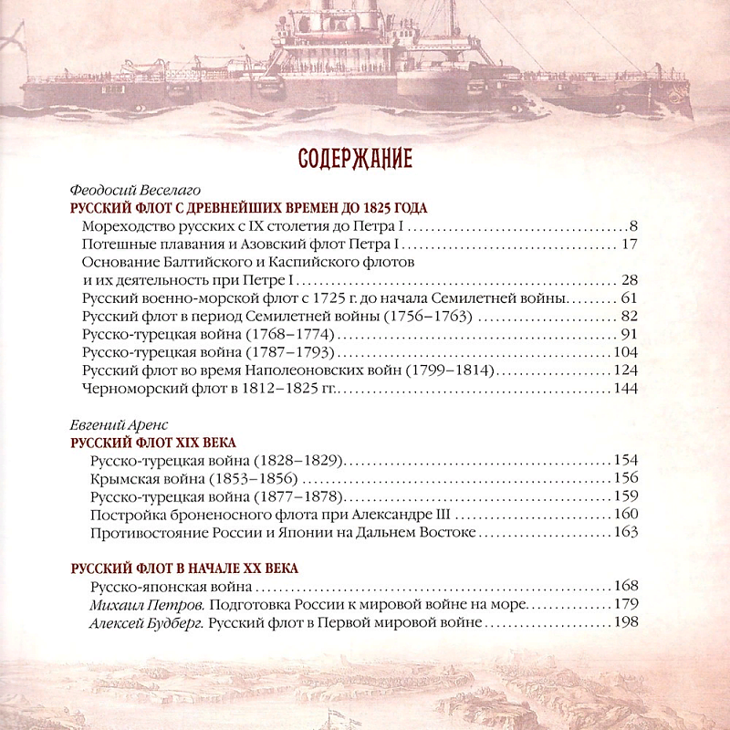 В фундаментальном труде «История русского флота», охватывающем период с древнейших времен до 1917 года, представлен тщательно собранный и систематизированный массив уникальных исторических материалов. В работе над этим научным изданием приняли участие выдающиеся военно-морские историки, такие как Феодосий Веселаго, Евгений Аренс, Михаил Петров и Алексей Будберг, чьи исследования внесли значительный вклад в развитие историографии российского флота.