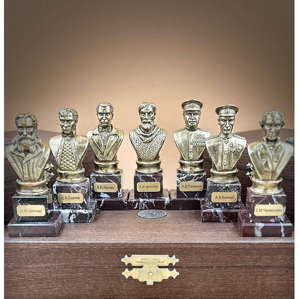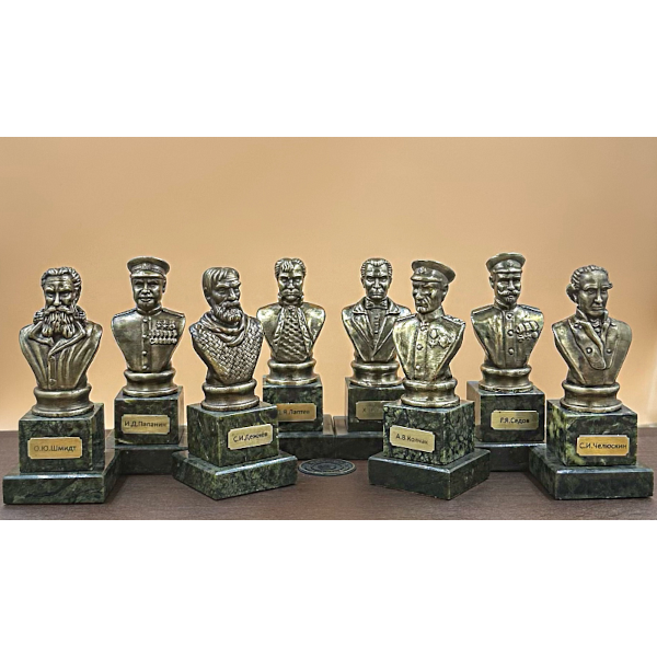 Коллекция «Покорители Арктики» представляет собой тщательно подобранный ансамбль бронзовых бюстов, запечатлевших образы выдающихся мореплавателей, чьи подвиги внесли неоценимый вклад в исследование и освоение арктических регионов. В состав коллекции входят семь миниатюрных бюстов, посвященных О.Ю. Шмидту, Д.Я. Лаптеву, Х.П. Лаптеву, С.И. Дежневу, И.Д. Папанину, А.В. Колчаку и С.И. Челюскину (возможна замена на бюст Г.Я. Седова), что позволяет охватить наиболее значимые фигуры в истории арктических исследований.