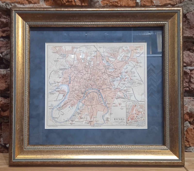Старинный план Москвы — карта в отличном коллекционном состоянии, помещенная в багет из натурального дерева под стекло, и декорированная паспарту из итальянского бархата. Детальный высококачественный план города отражал всю актуальную информацию о Москве на момент издания в конце XIX столетия.