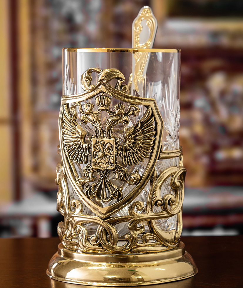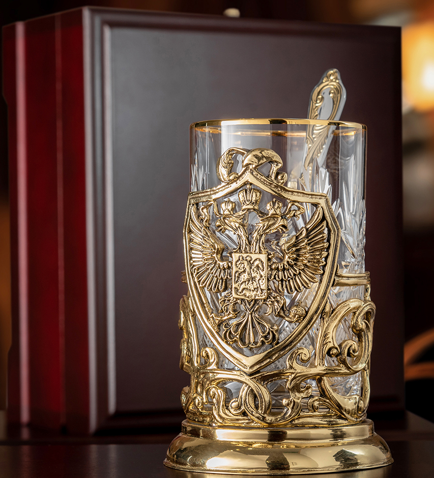 Подстаканник «Герб России» в подарочном коробе ручной работы из массива дерева, выполненный в традиционной технике точного художественного литья из латуни с ручной финишной обработкой — отличный VIP-сувенир для руководителя, делового партнера или представителя официальной делегации. Этот роскошный, но, в то же время, сдержанный и консервативный подарок будет принят с восхищением и благодарностью. Купить подарочный подстаканник с изображением герба России вы можете в нашем Бутике подарков PrestigeGIFTS.ru с доставкой в точно согласованное с вами время.