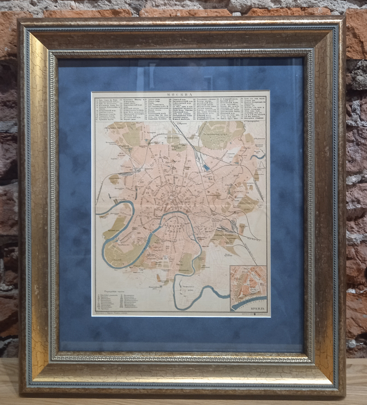 Старинная карта Москвы в отличном коллекционном состоянии помещена в под стекло в багет из натурального дерева и украшена изысканным бархатным паспарту.