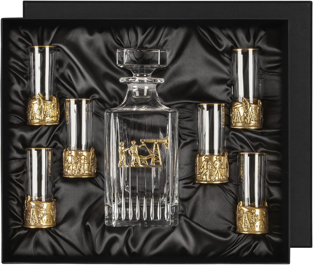 Этот большой подарочный набор для крепких напитков «Нефтяник» содержит красивый стеклянный штоф объемом 700 мл и шесть стопок 60 мл с изображением нефтяников, выполненным в технике точного художественного литья. Дорогой комплект на тему нефтяной промышленности — замечательный подарок на День нефтяника или по другому торжественному поводу. Такой презент означает признание вами высоких профессиональных достижений его получателя и будет очень красиво смотреться в рабочем кабинете или дома. Купить комплект для крепких алкогольных напитков с символикой добычи нефти вы можете в нашем Бутике подарков PrestigeGIFTS.ru с быстрой и удобной доставкой.