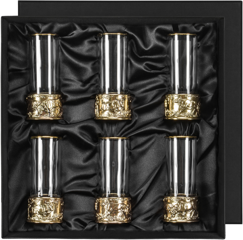 6 стопок для крепких спиртных напитков 60 мл из стекла с латунным художественным литьем