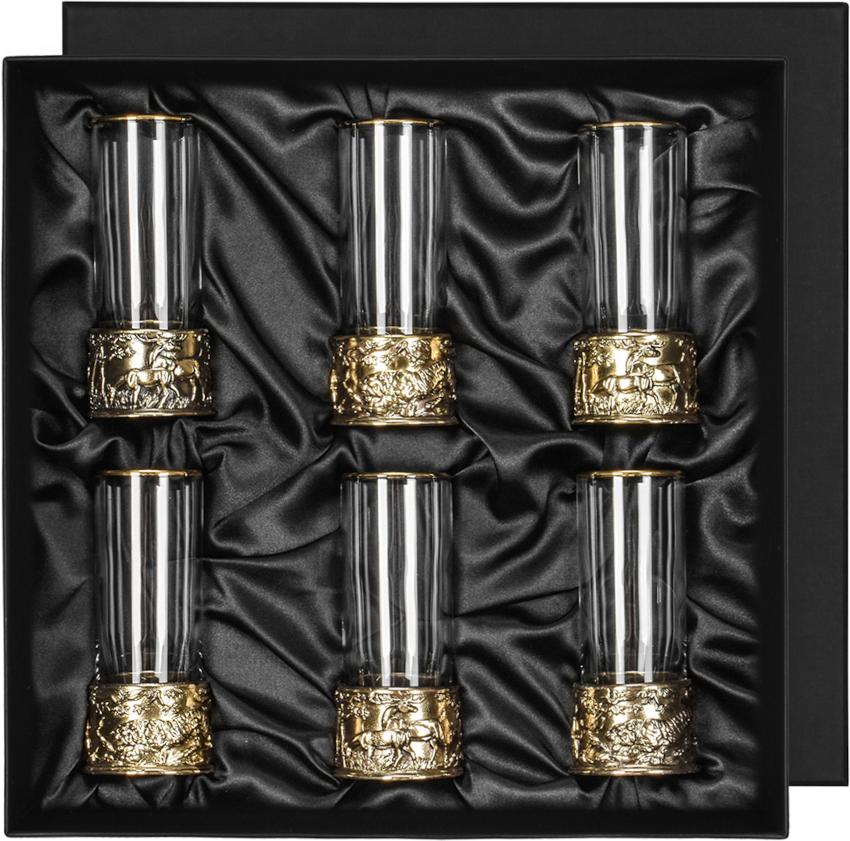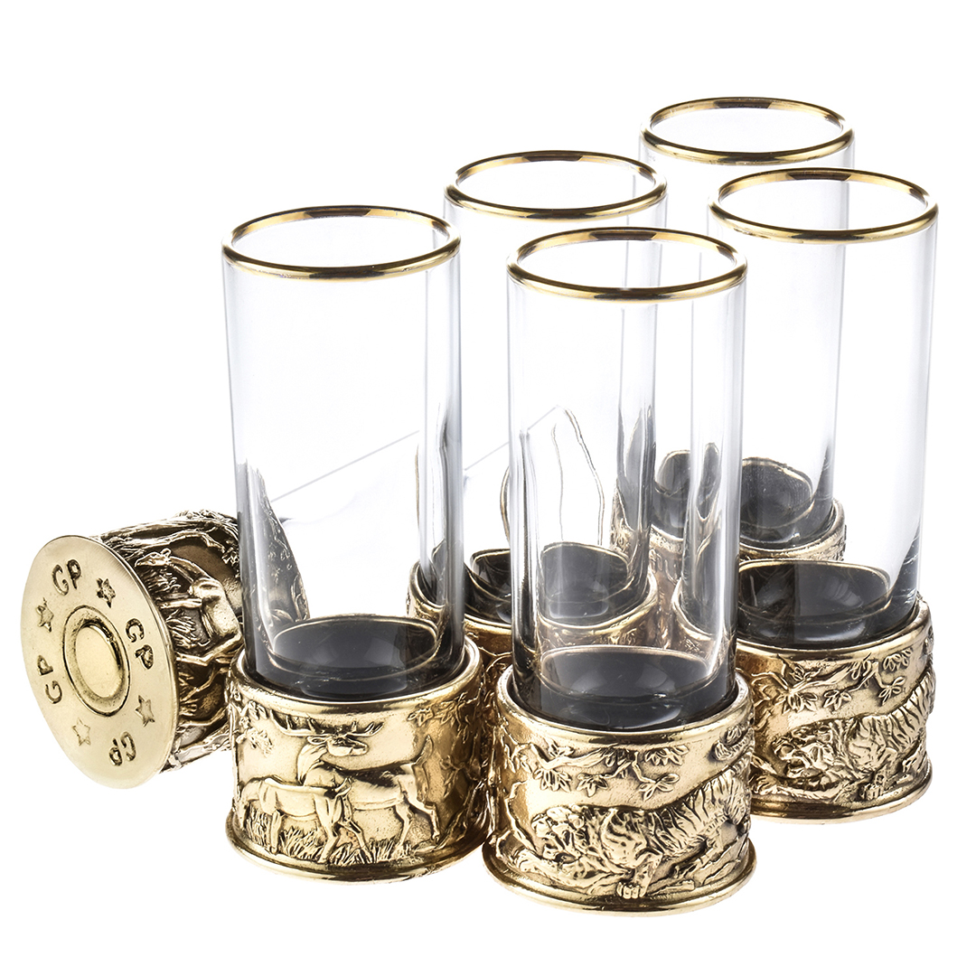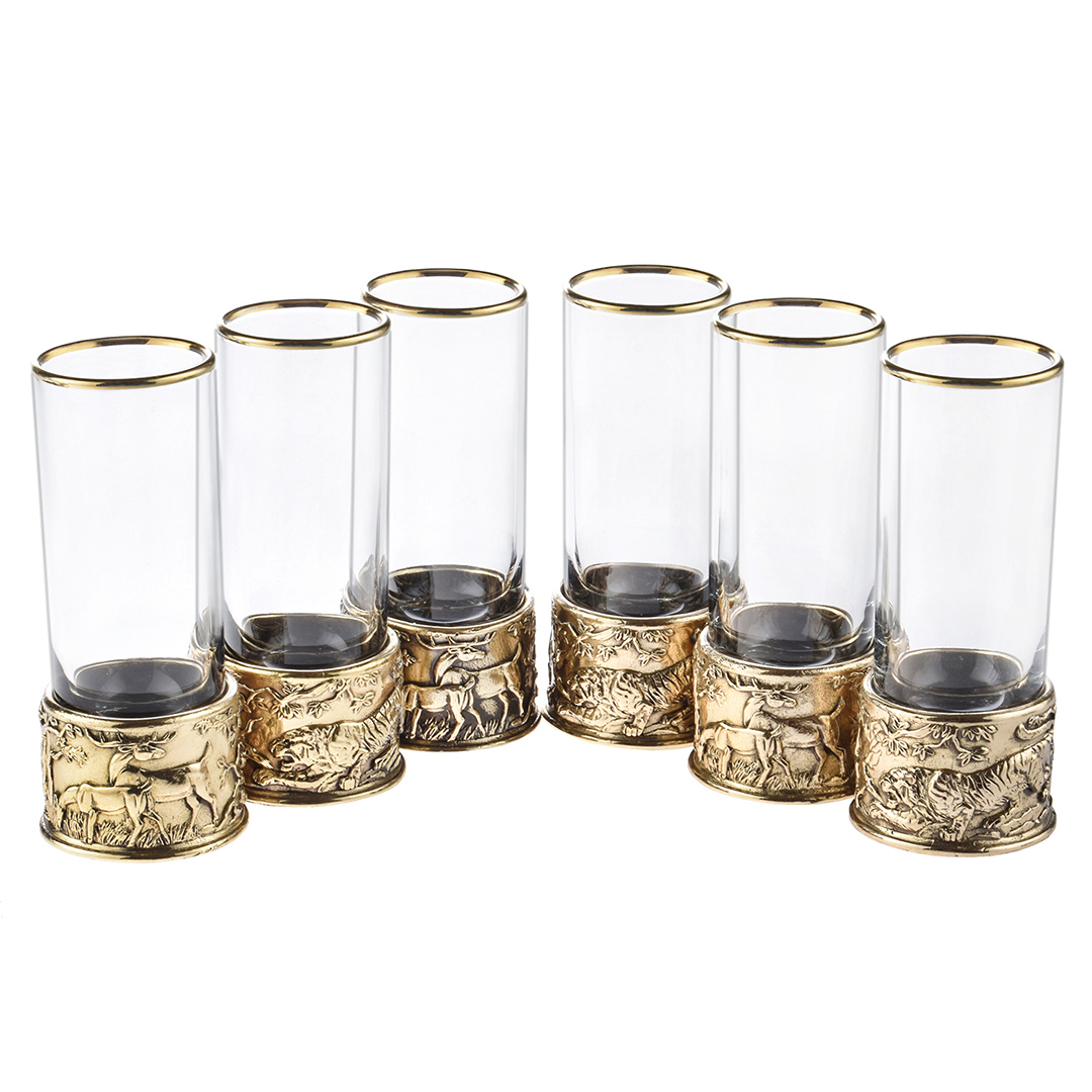 6 стопок для крепких спиртных напитков 60 мл из стекла с латунным художественным литьем