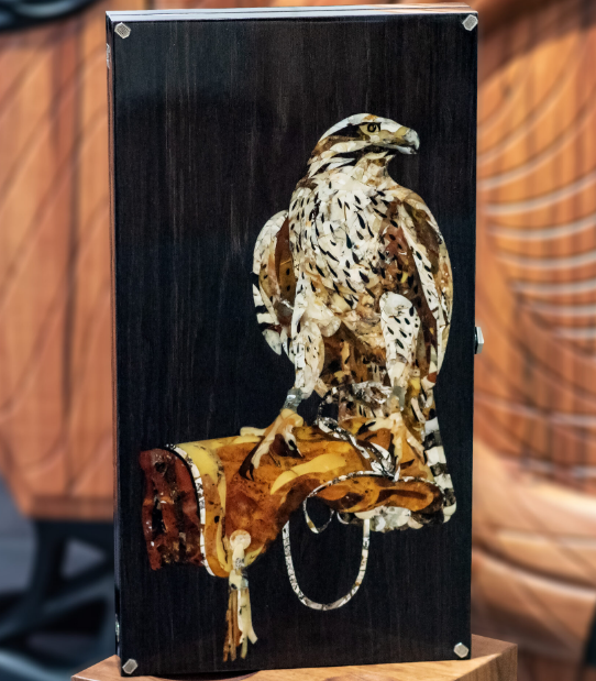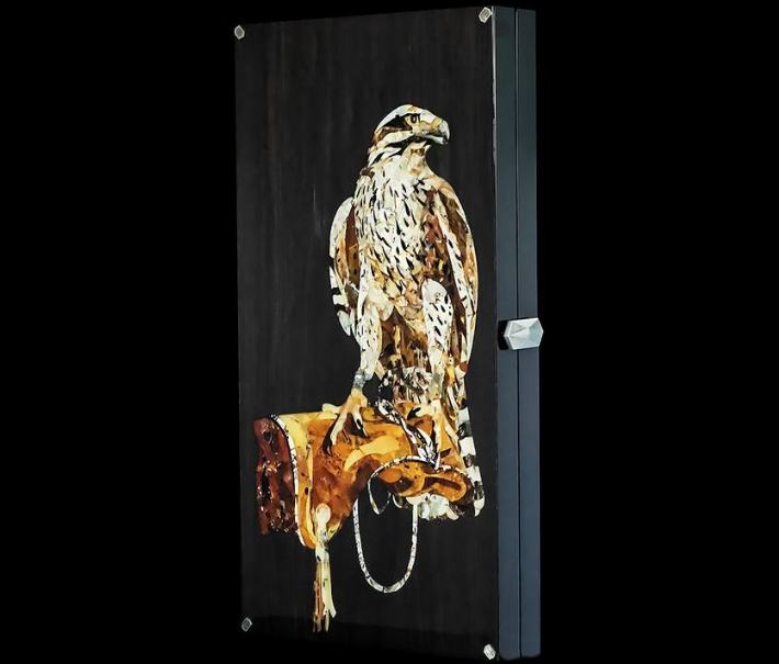 Элитные нарды ручной работы из мореного дуба с изображением охотничьего сокола в технике инкрустации балтийским янтарем - ценный VIP-подарок!