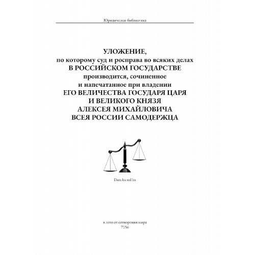 Соборное уложение 1649 года является первым систематизированным сводом законов Российской империи, который стал фундаментальным документом в истории российского права. Этот нормативный акт регулировал широкий спектр общественных отношений, охватывая такие аспекты, как семейные и имущественные права, уголовное законодательство, а также регламентируя систему государственного управления и судопроизводства. Уложение закрепило социальную стратификацию и официально утвердило крепостное право, что оказало значительное влияние на социально-экономическое развитие государства.