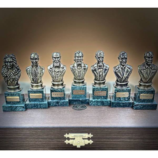 В коллекции «Великие русские юристы» представлены бронзовые бюсты семи выдающихся деятелей юридической науки Российской империи и СССР, каждый из которых воплощает уникальные черты и достижения своих исторических прототипов. Эти миниатюрные скульптуры, выполненные с ювелирной точностью, изображают П.И. Ягужинского, А.Н. Радищева, А.Ф. Кони, Ф.Н. Плевако, В.Д. Спасовича, А.Я. Вышинского и Р.А. Руденко.