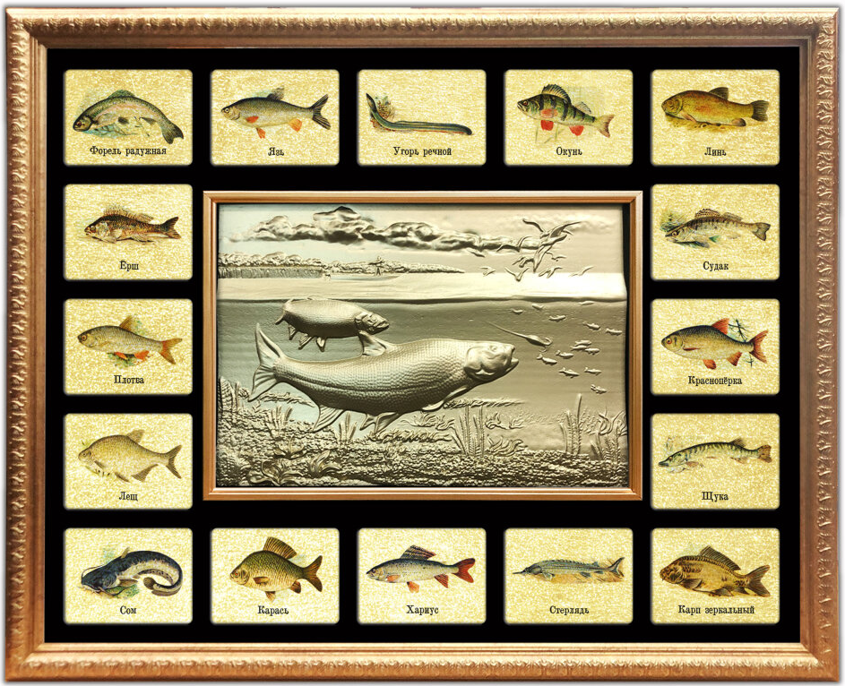 Центральным элементом композиции является барельеф высокой степени детализации и выразительности. Вокруг центрального изображения размещены миниатюрные миниатюры пресноводных рыб, обитающих в водоемах России, выполненные в технике печати по сусальному золоту. Эти элементы придают картине дополнительную художественную ценность и символическую глубину, подчеркивая ее связь с национальной культурой и природой.