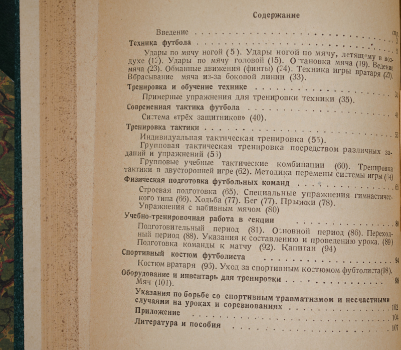 Введение — Техника футбола — Тренировка и обучение технике — Современная тактика футбола — Тренировка тактики — Физическая подготовка футбольных команд — Учебно-тренировочная работа в секции — Спортивный костюм футболиста — Оборудование и инвентарь для тренировки — Указания по борьбе со спортивным травматизмом и несчастными случаями на уроках и соревнованиях — Приложение — Литература и пособия.